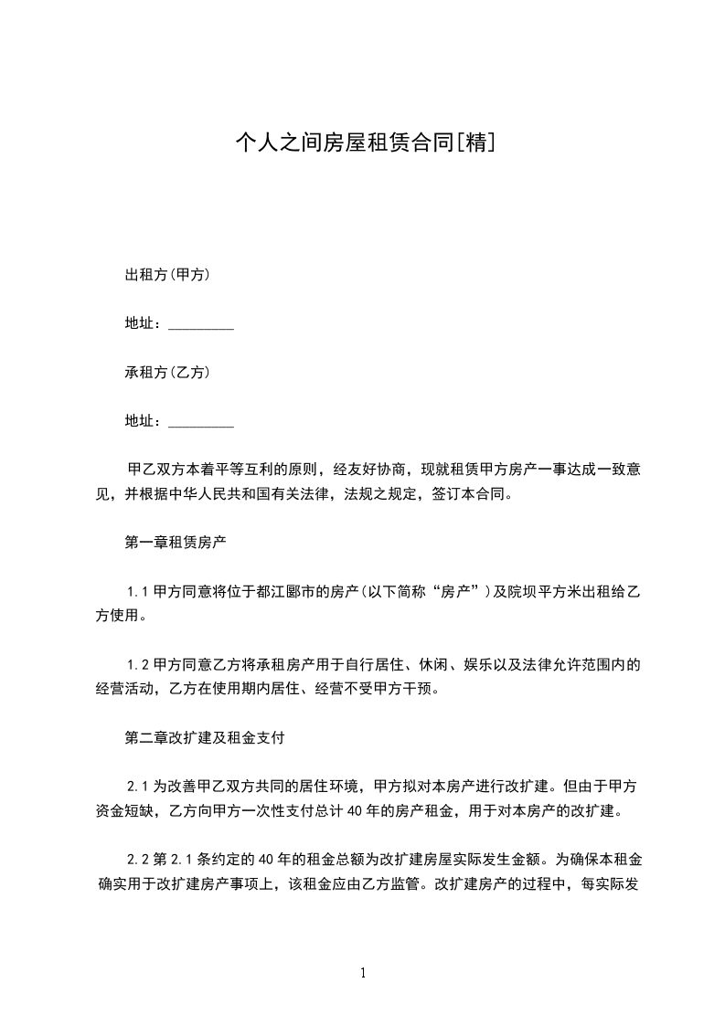 2.1为改善甲乙双方共同的居住环境,甲方拟对本房产进行改扩建。但由于甲方资金短缺,乙方向甲方一次性支付总计40年的房产租金,用于对本房产的改扩建。
