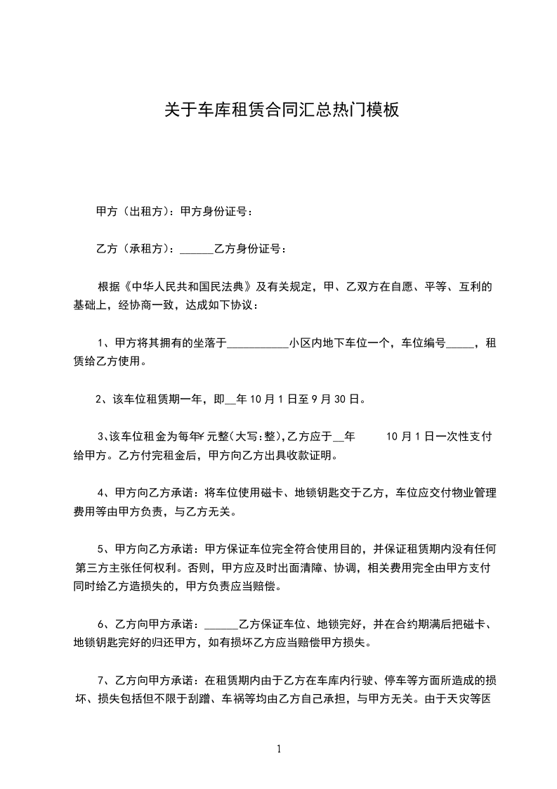 1、甲方将其拥有的坐落于___________小区内地下车位一个,车位编号_____,租赁给乙方使用。