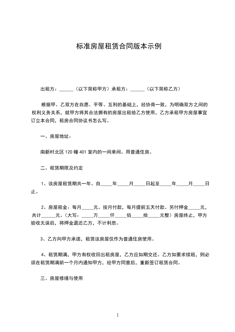 2、甲方出租给乙方的房屋租赁期共______个月。自________年____月____日起至________年____月____日止。乙方向甲方承诺,租赁该房屋仅作为居住使用。租赁期满,甲方有权收回出租房屋,乙方应如期交还。乙方如要求续租,则必须在租赁期满______个月之前书面通知甲方,经甲方同意后,重新签订租赁合同。