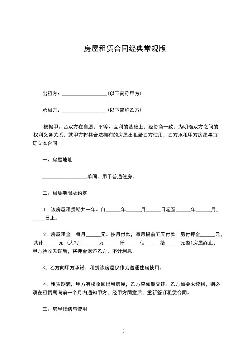 1、该房屋租赁期共一年。自______年______月______日起至______年______月______日止。