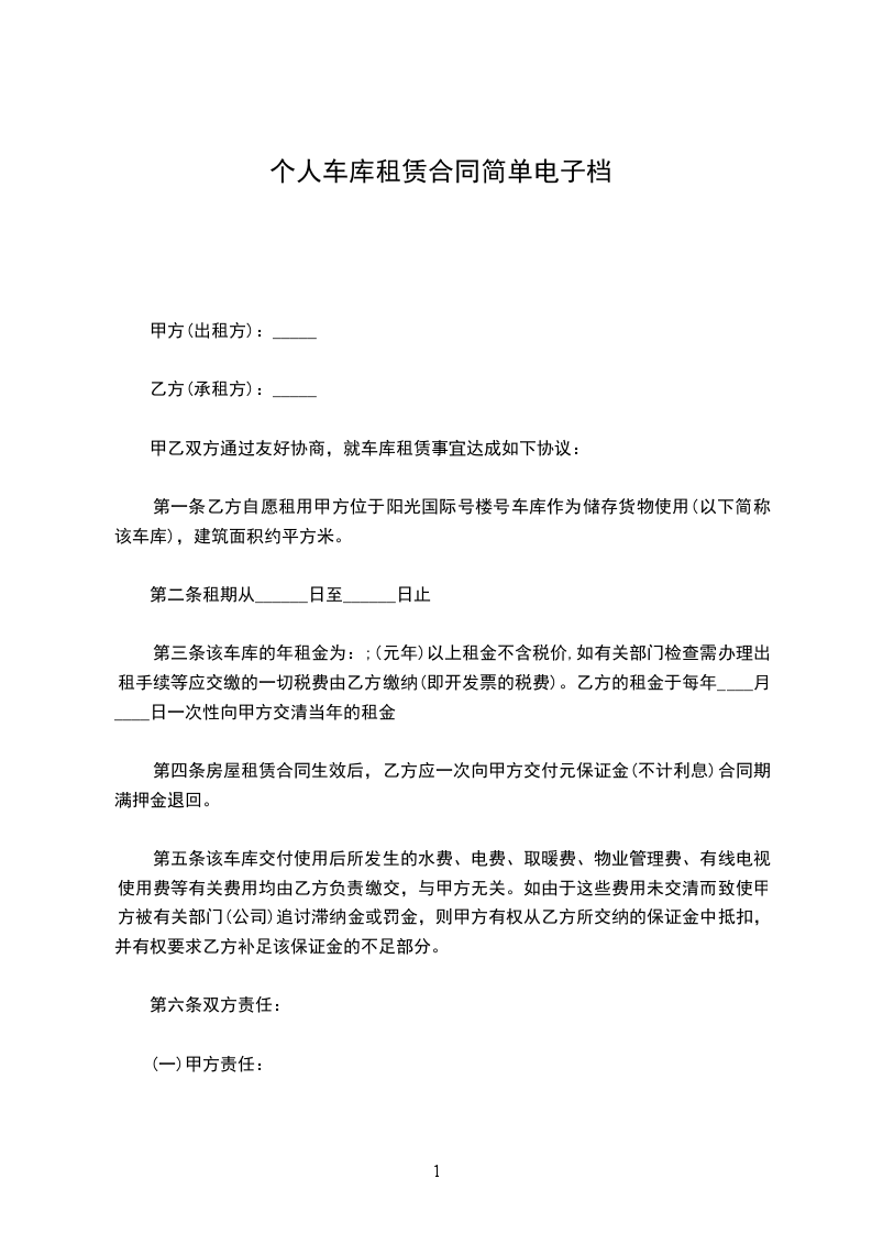 第一条乙方自愿租用甲方位于阳光国际号楼号车库作为储存货物使用(以下简称该车库),建筑面积约平方米。