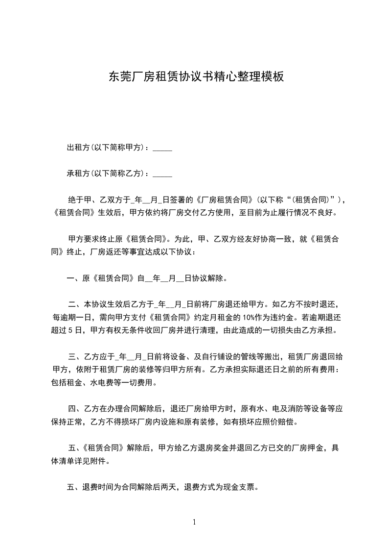 二、本协议生效后乙方于_年__月_日前将厂房退还给甲方。如乙方不按时退还,每逾期一日,需向甲方支付《租赁合同》约定月租金的10%作为违约金。若逾期退还超过5日,甲方有权无条件收回厂房并进行清理,由此造成的一切损失由乙方承担。