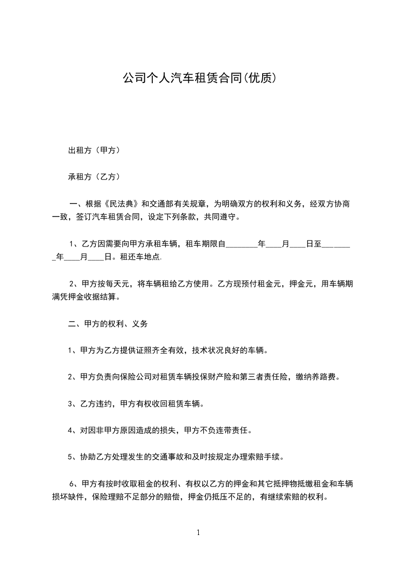 一、根据《中华人民共和国民法典》和交通部有关规章,为明确双方的权利和义务,经双方协商一致,签订汽车租赁合同,设定下列条款,共同遵守。