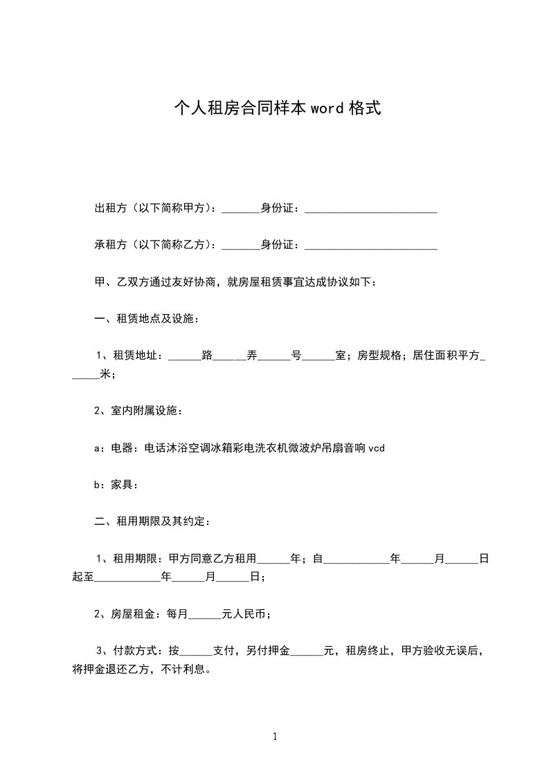 个人房屋租赁合同范本标准版一