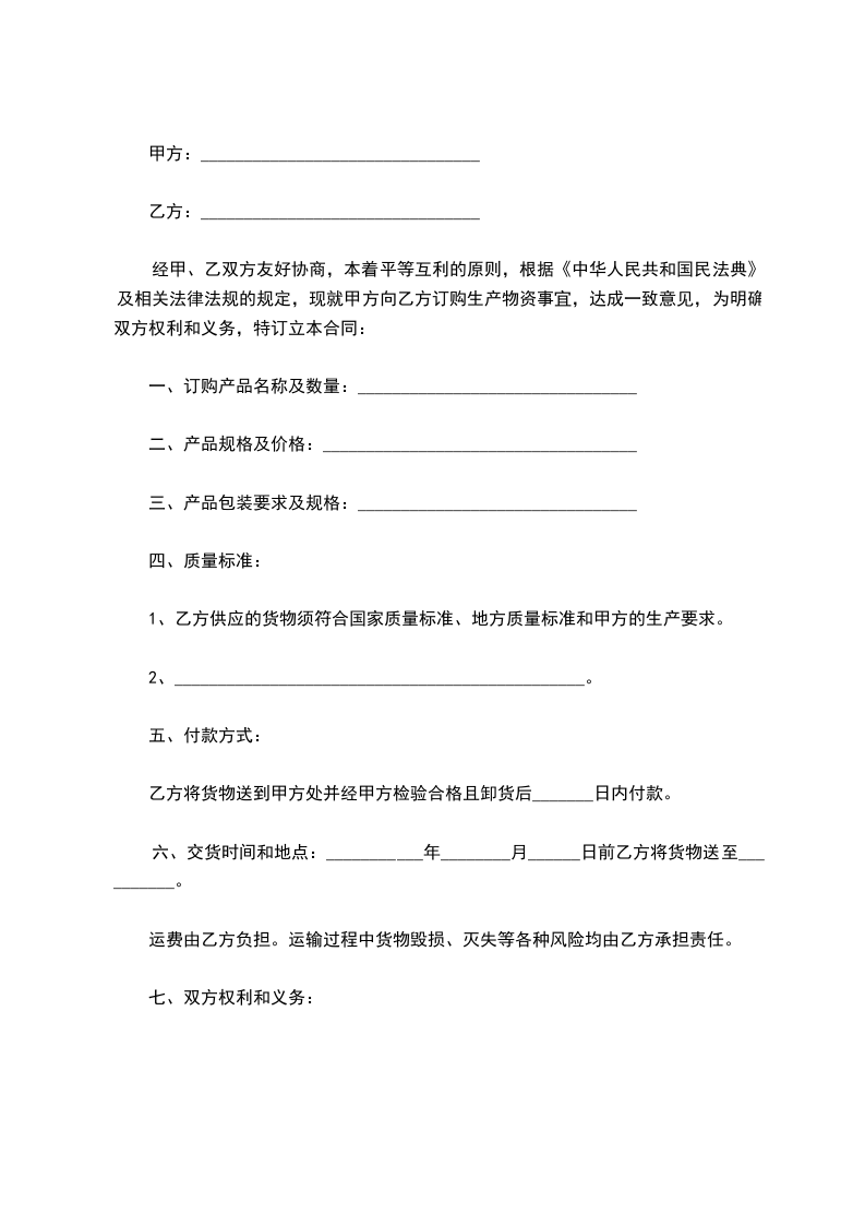 经甲、乙双方友好协商,本着平等互利的原则,根据《中华人民共和国民法典》及相关法律法规的规定,现就甲方向乙方订购生产物资事宜,达成一致意见,为明确双方权利和义务,特订立本合同: