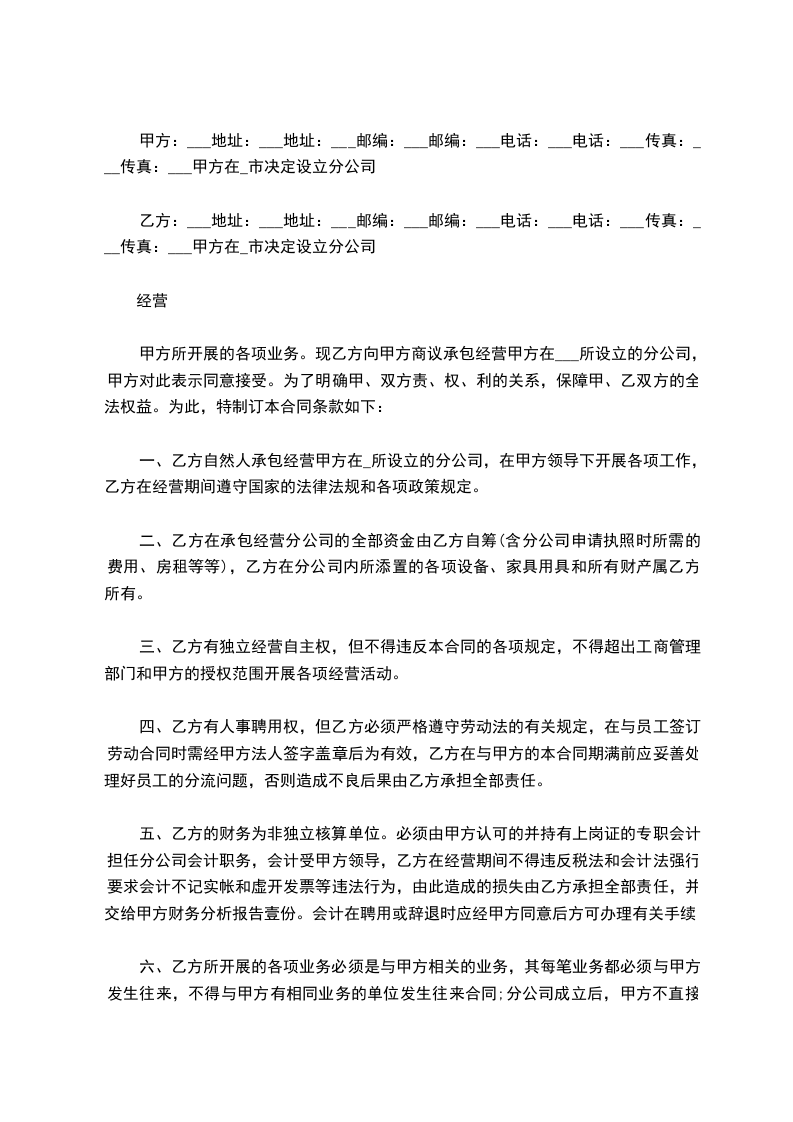 甲方所开展的各项业务。现乙方向甲方商议承包经营甲方在___所设立的分公司,甲方对此表示同意接受。为了明确甲、双方责、权、利的关系,保障甲、乙双方的全法权益。为此,特制订本合同条款如下: