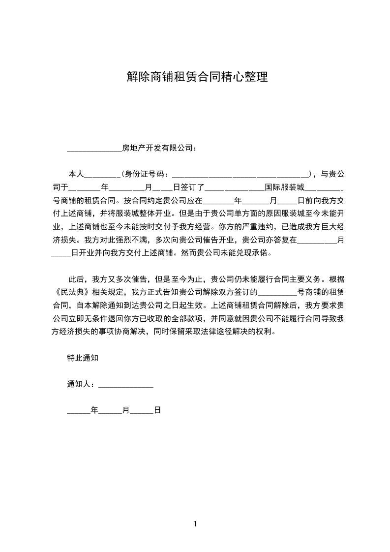本人_________(身份证号码:__________________________________),与贵公司于________年_________月_____日签订了_______________国际服装城__________号商铺的租赁合同。按合同约定贵公司应在________年_______月_____日前向我方交付上述商铺,并将服装城整体开业。但是由于贵公司单方面的原因服装城至今未能开业,上述商铺也至今未能按时交付予我方经营。你方的严重违约,已造成我方巨大经济损失。我方对此强烈不满,多次向贵公司催告开业,贵公司亦答复在__________月_____日开业并向我方交付上述商铺。然而贵公司未能兑现承偌。