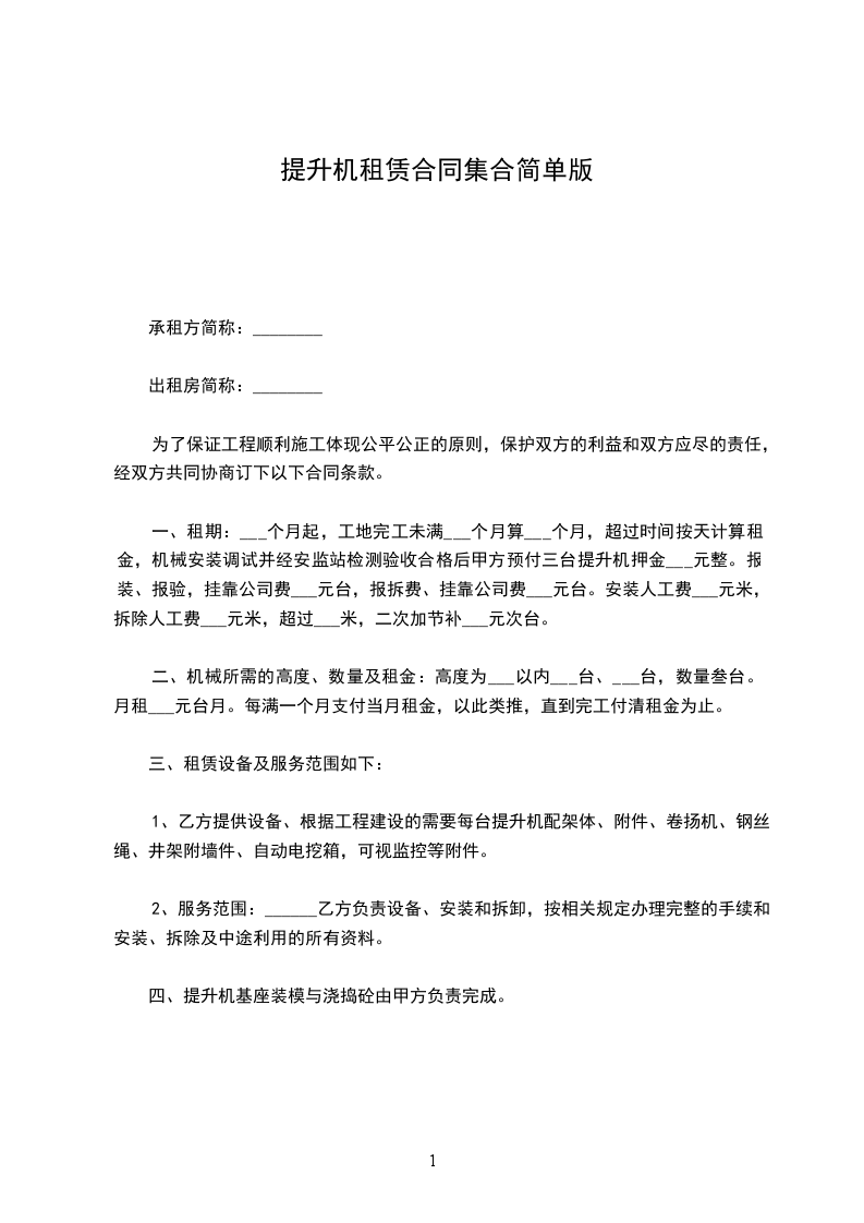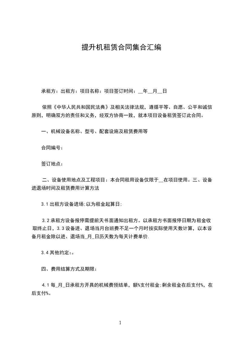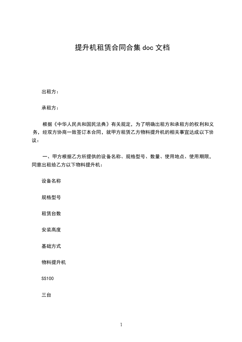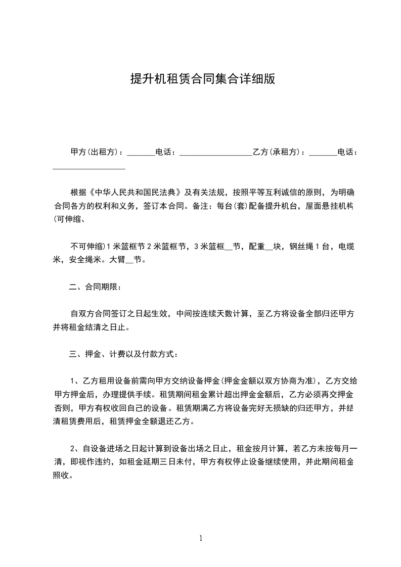 根据《中华人民共和国民法典》及有关法规,按照平等互利诚信的原则,为明确合同各方的权利和义务,签订本合同。备注:每台(套)配备提升机台,屋面悬挂机构(可伸缩、