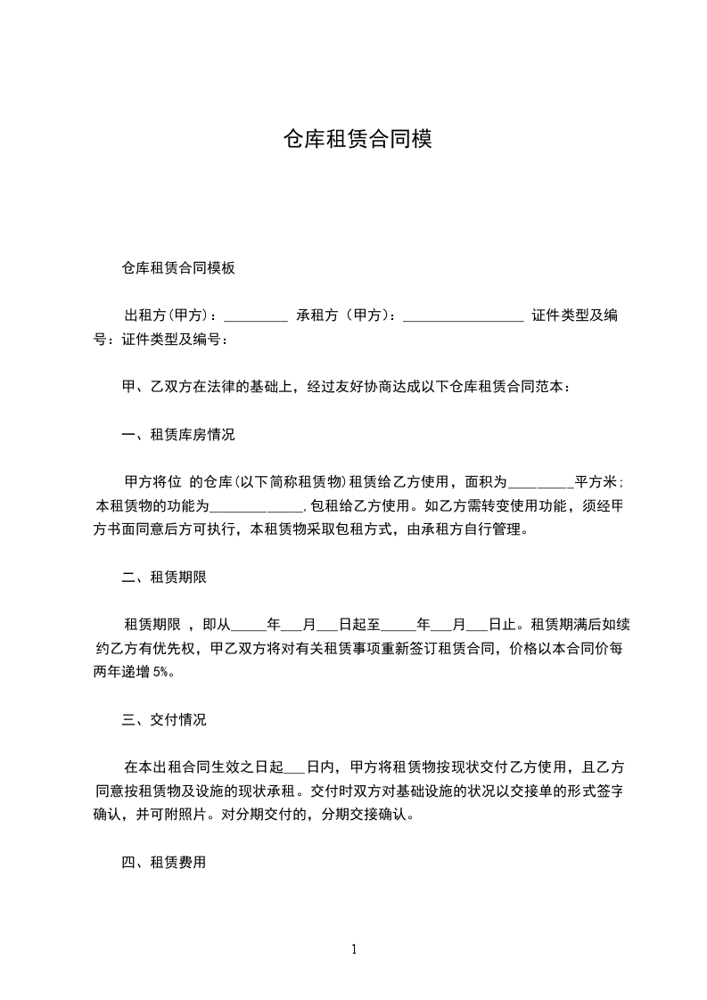 租赁仓库的保证金为__个月的租金,即人民币__元(“保证金”)。乙方应于本合同签署当日一次性向甲方支付保证金。