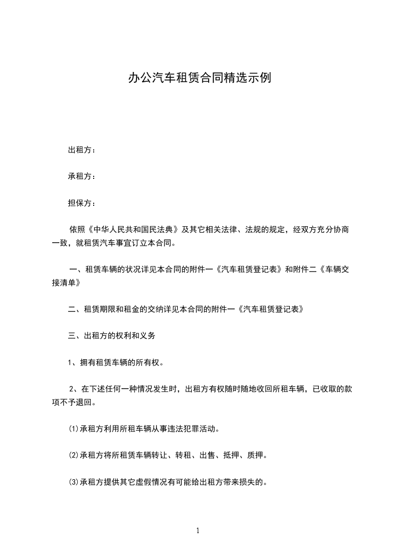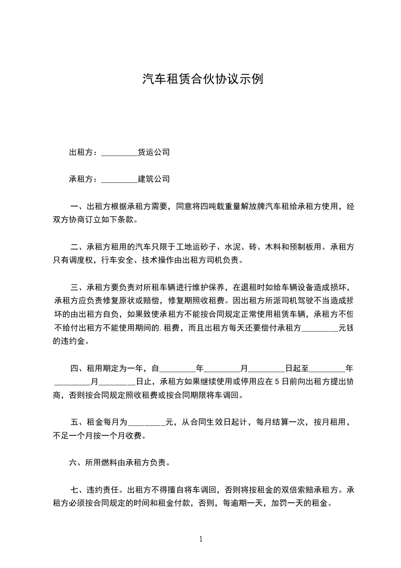一、出租方根据承租方需要,同意将四吨载重量解放牌汽车租给承租方使用,经双方协商订立如下条款。