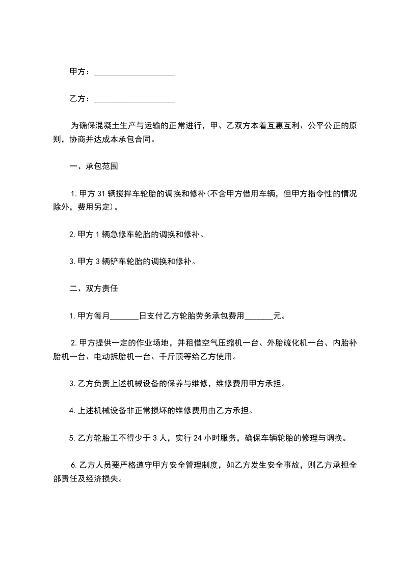 1.甲方31辆搅拌车轮胎的调换和修补(不含甲方借用车辆,但甲方指令性的情况除外,费用另定)。