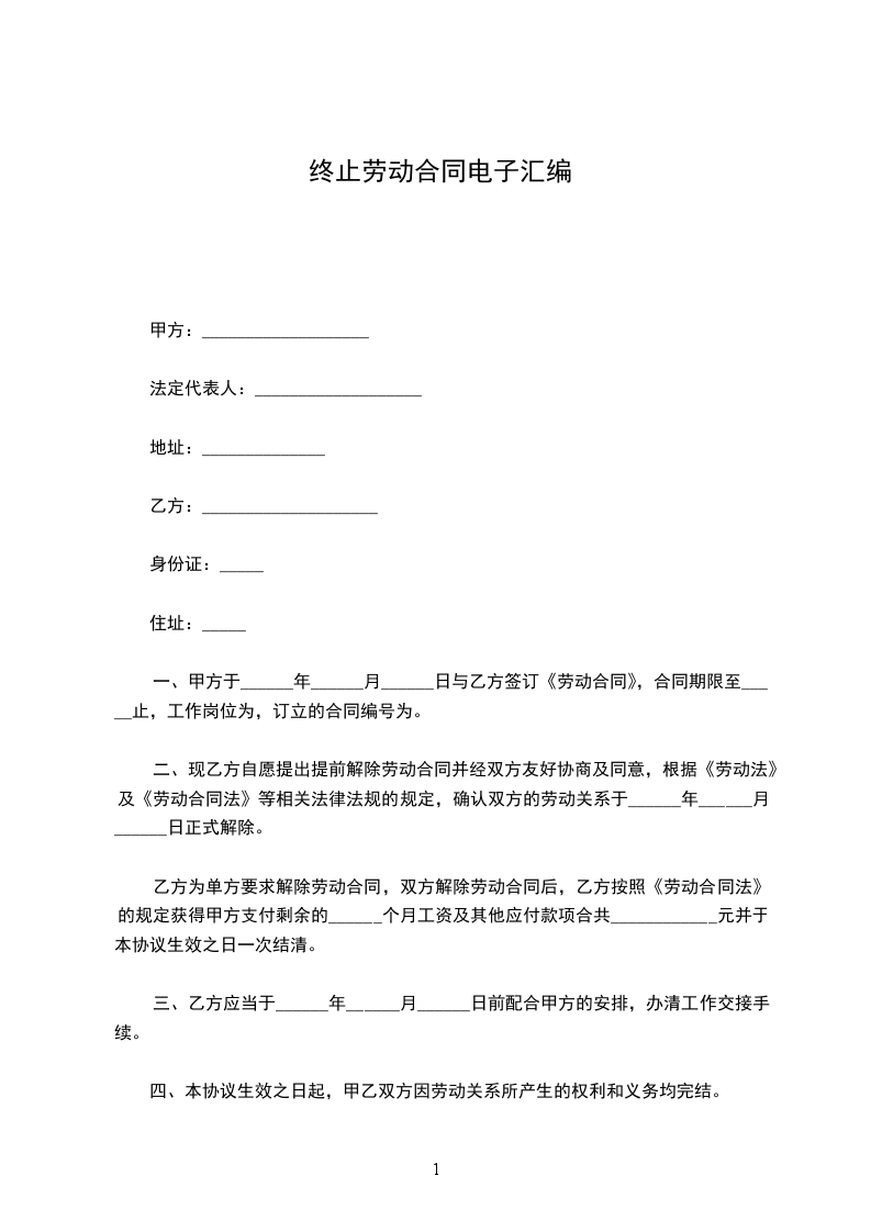 乙方为单方要求解除劳动合同,双方解除劳动合同后,乙方按照《劳动合同法》的规定获得甲方支付剩余的______个月工资及其他应付款项合共____________元并于本协议生效之日一次结清。