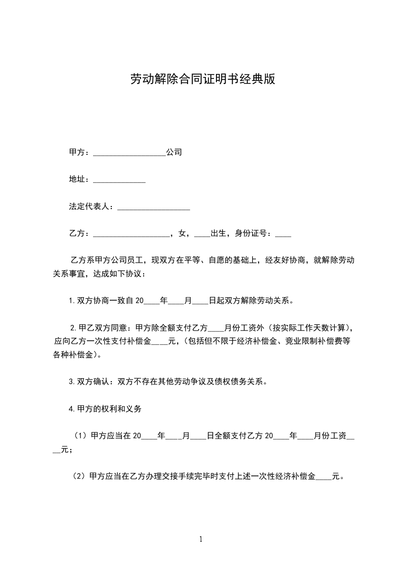 2.甲乙双方同意:甲方除全额支付乙方____月份工资外(按实际工作天数计算),应向乙方一次性支付补偿金____元,(包括但不限于经济补偿金、竞业限制补偿费等各种补偿金)。