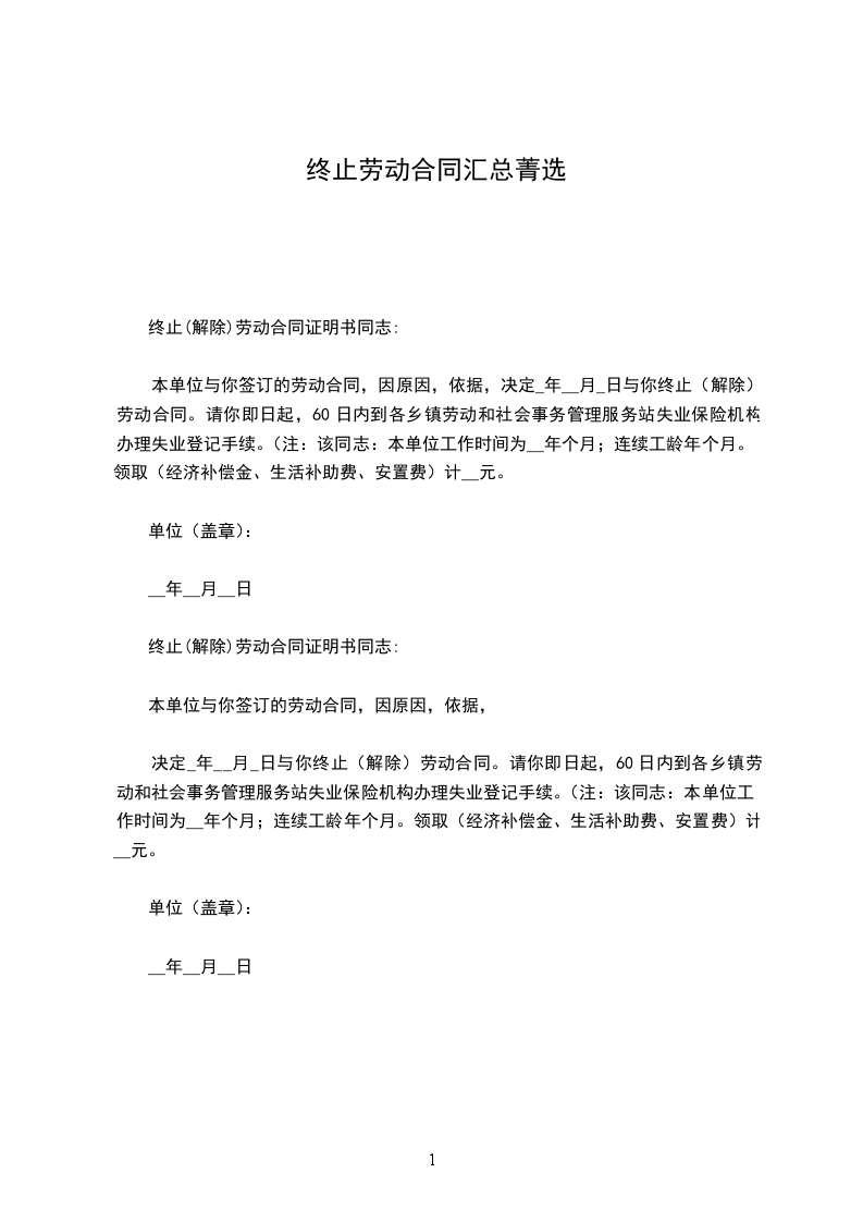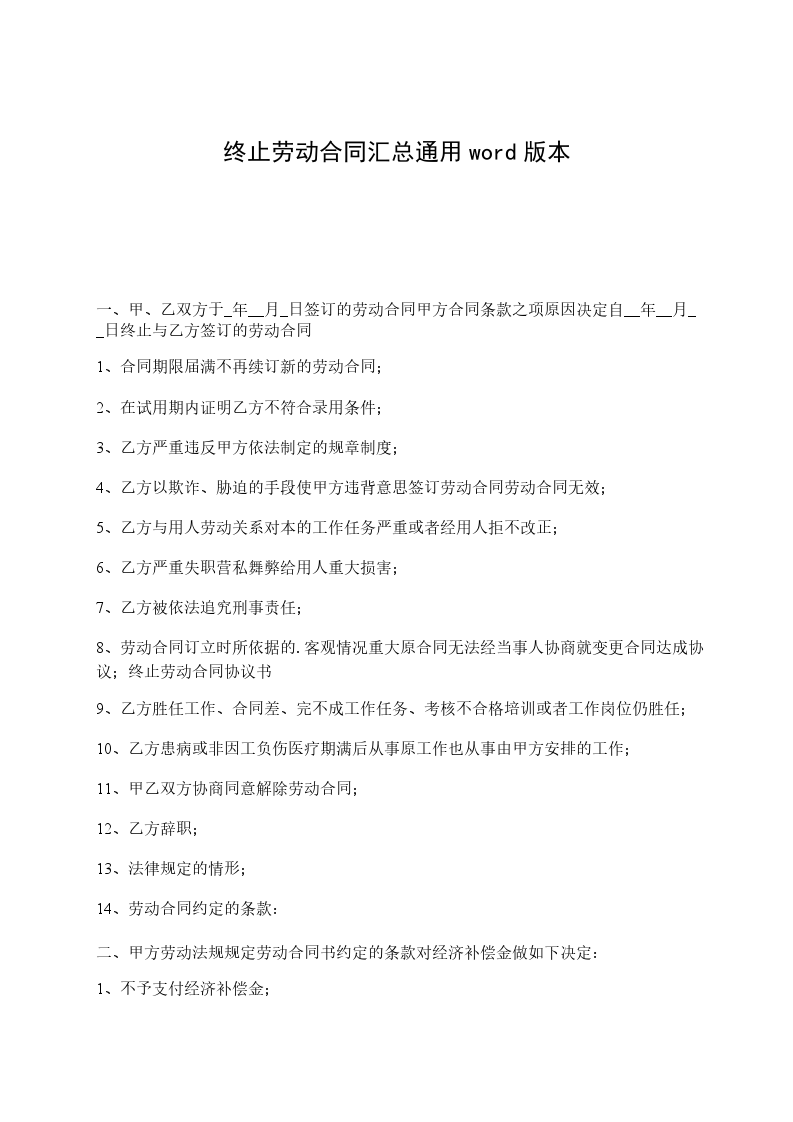 一、甲、乙双方于_年__月_日签订的劳动合同甲方合同条款之项原因决定自__年__月__日终止与乙方签订的劳动合同