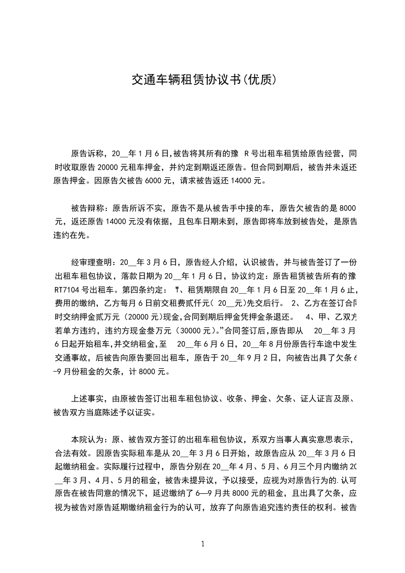 七、违约责任。出租方不得擅自将车调回,否则将按租金的双倍索赔承租方。承租方必须按合同规定的时间和租金付款,否则,每逾期一天,加罚一天的租金。