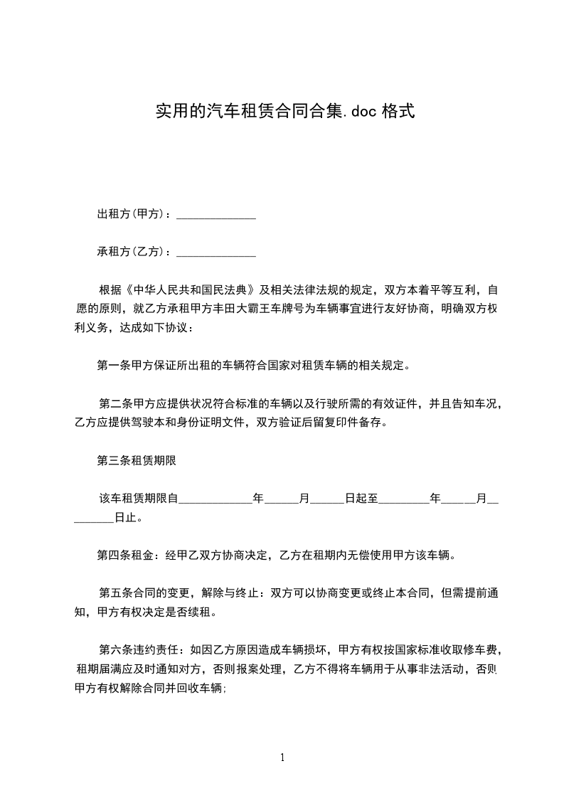 一、根据《中华人民共和国民法典》和交通部有关规章,为明确双方的权利和义务,经双方协商一致,签订汽车租赁合同,设定下列条款,共同遵守。