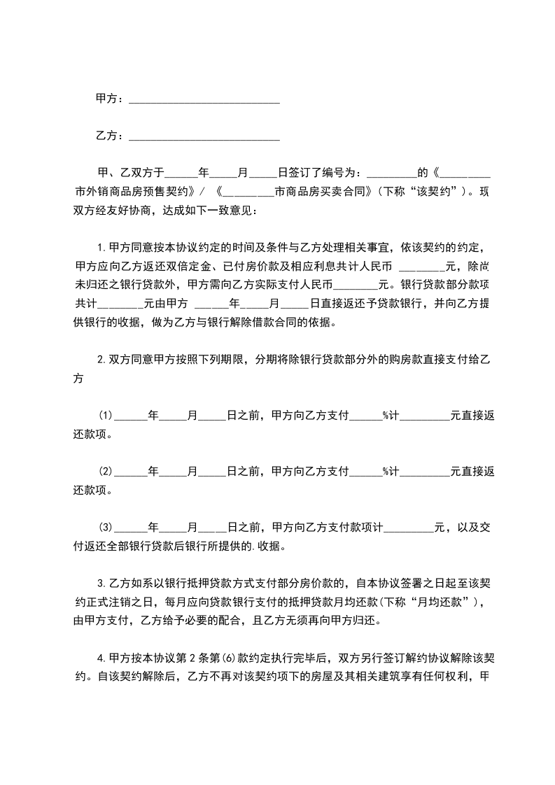 第七条买卖双方在主合同及本补充协议履行过程中,如无任何约定或法定的解除条件下单方面要求解除主合同及本补充协议的,均视为违约,违约方按合同约定的购房总款的15%向守约方支付违约金后方可解除主合同及本补充协议。买、卖双方行使合同解除权并导致主合同及本补充协议解除的,自解除之日起5日内买受人应协助出卖人到房管局办理买卖合同备案登记的撤销手续,否则出卖人有权拒绝退还买受人购房款。