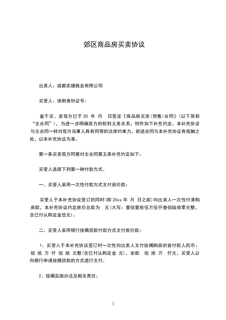 1、买受人于本补充协议签订时一次性向出卖人支付按揭购房的首付款人民币: 佰 拾 万 仟 佰 拾 元整(含已付认购定金 元),余款: 佰 拾 万 仟元,买受人以向银行申请按揭贷款的方式进行支付。