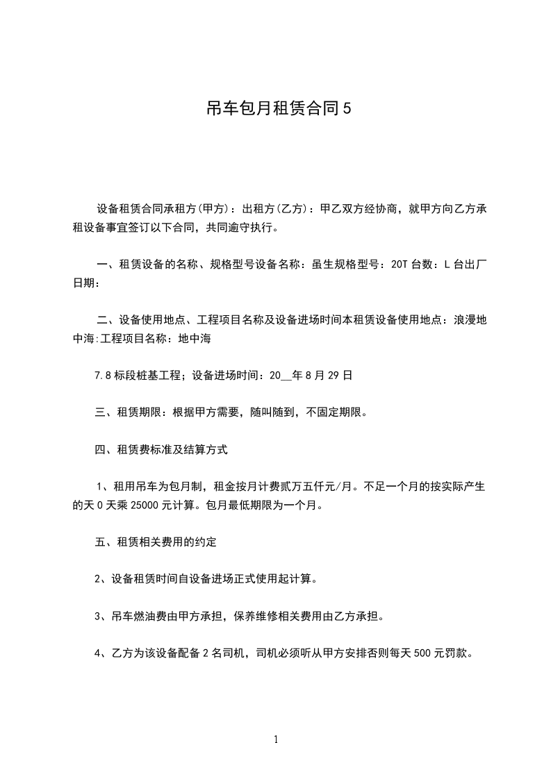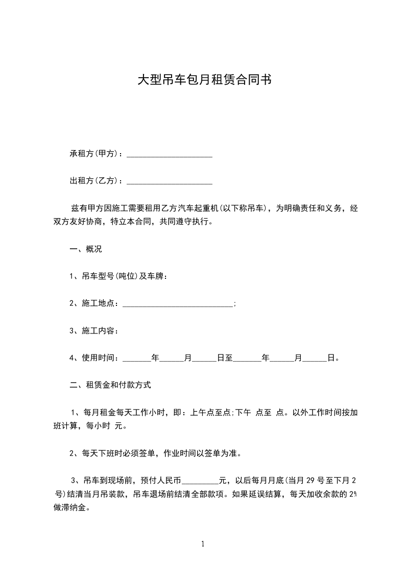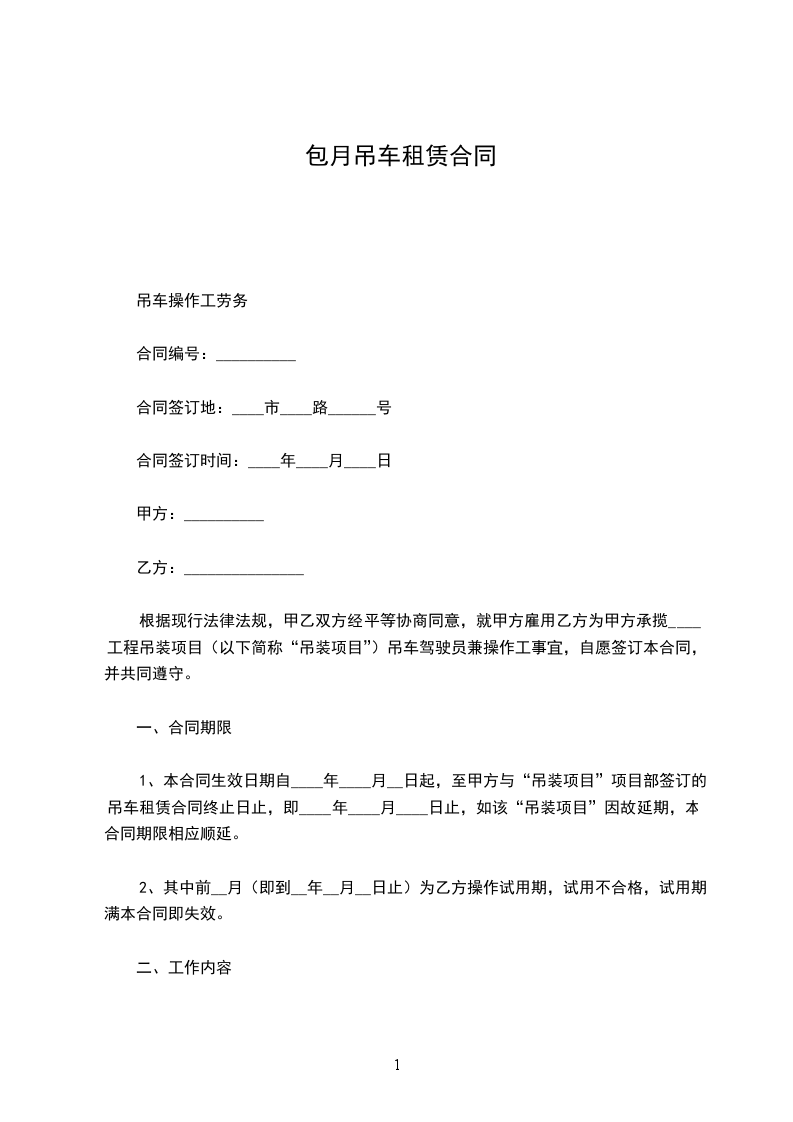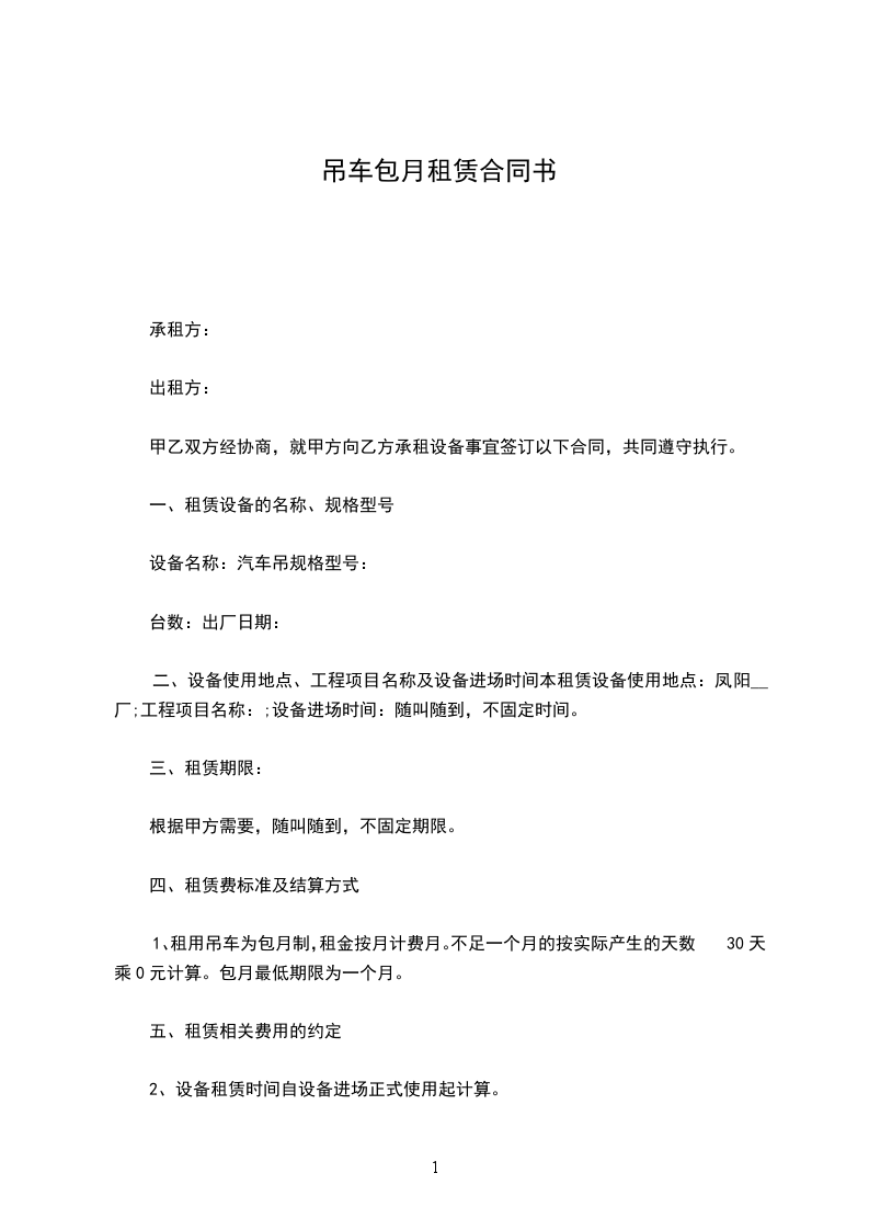 租用吊车为包月制,租金按月计费____元/月(含税金)。不足一个月的按实际产生的天数/30天乘60000元计算。包月最低期限为一个月。