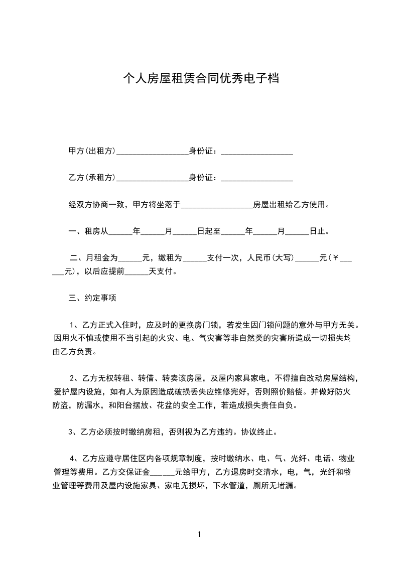 4、乙方应遵守居住区内各项规章制度,按时缴纳水、电、气、光纤、电话、物业管理等费用。乙方交保证金______元给甲方,乙方退房时交清水,电,气,光纤和物业管理等费用及屋内设施家具、家电无损坏,下水管道,厕所无堵漏。