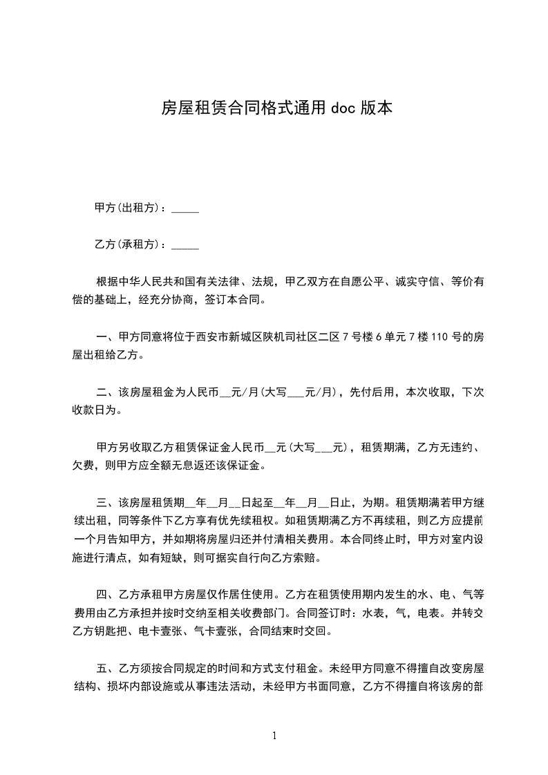 一、甲方同意将位于西安市新城区陕机司社区二区7号楼6单元7楼110号的房屋出租给乙方。