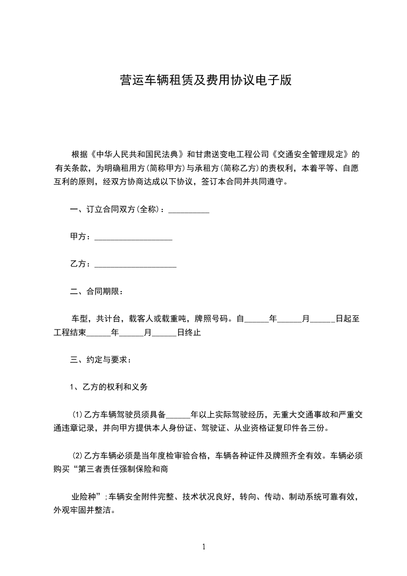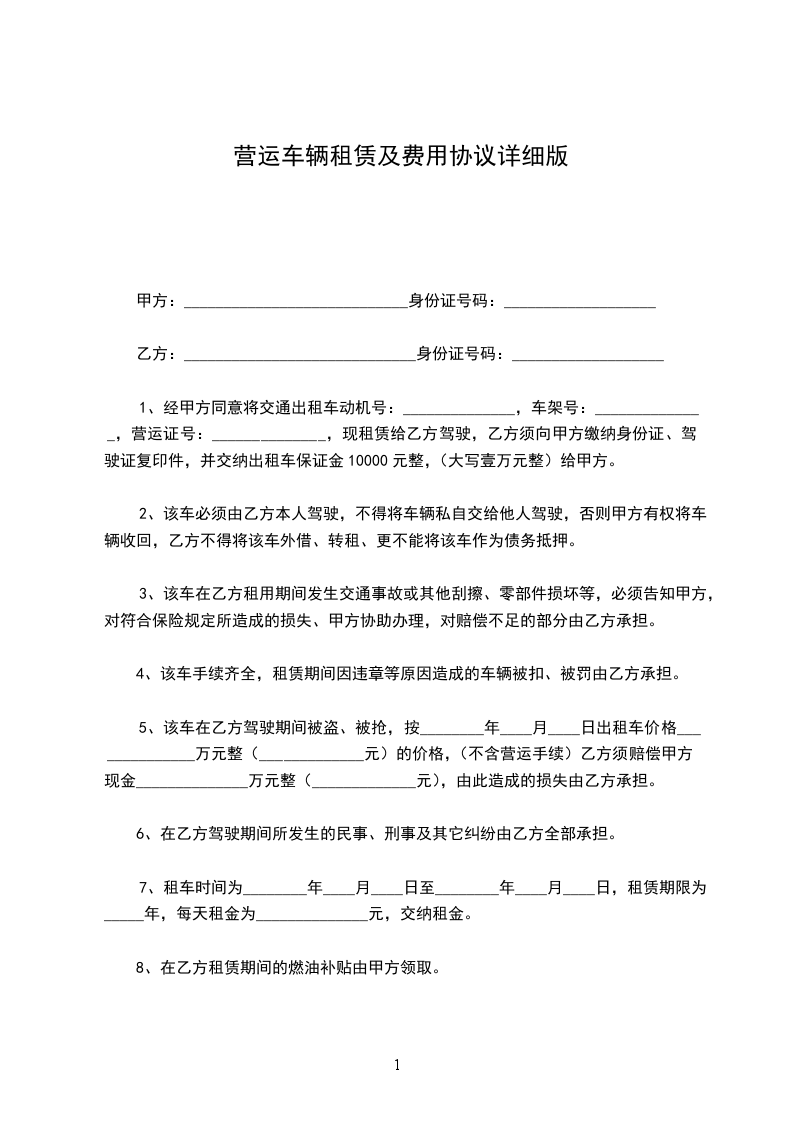 1、经甲方同意将交通出租车动机号:______________,车架号:______________,营运证号:______________,现租赁给乙方驾驶,乙方须向甲方缴纳身份证、驾驶证复印件,并交纳出租车保证金10000元整,(大写壹万元整)给甲方。
