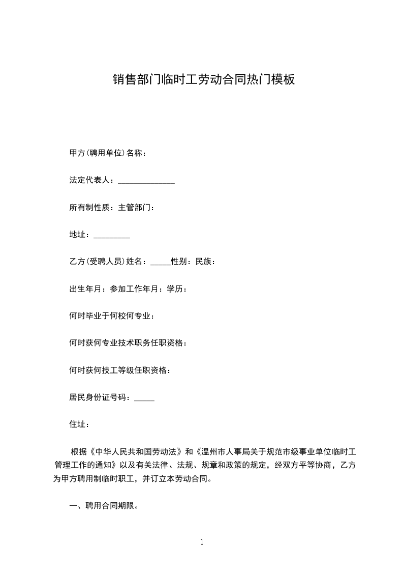 根据《中华人民共和国劳动法》和《温州市人事局关于规范市级事业单位临时工管理工作的通知》以及有关法律、法规、规章和政策的规定,经双方平等协商,乙方为甲方聘用制临时职工,并订立本劳动合同。