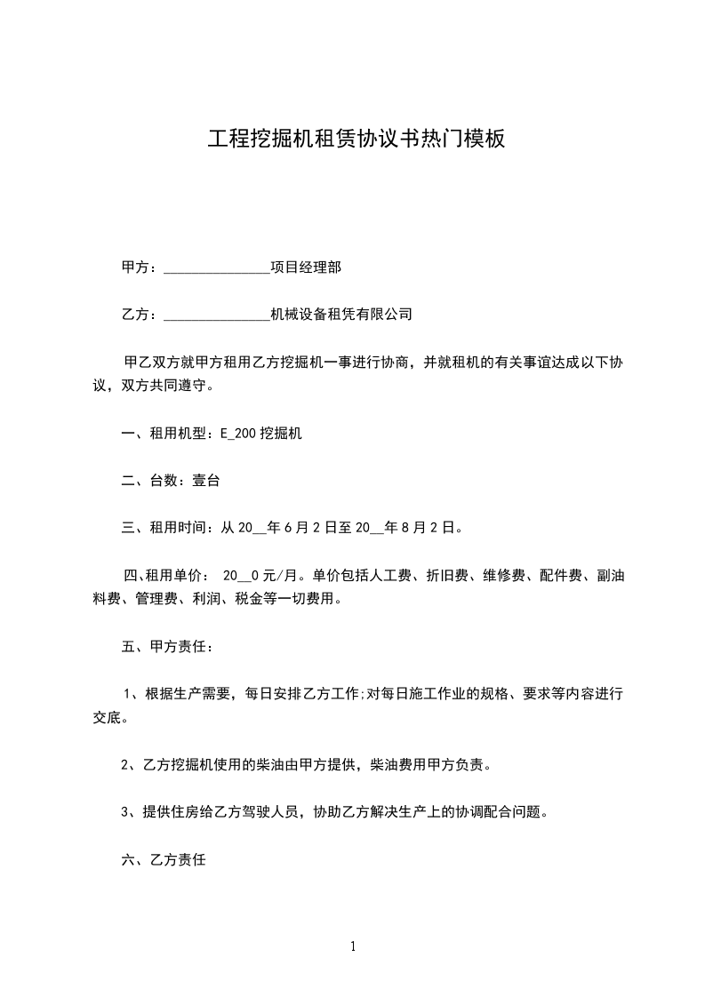 四、租用单价:20__0元/月。单价包括人工费、折旧费、维修费、配件费、副油料费、管理费、利润、税金等一切费用。