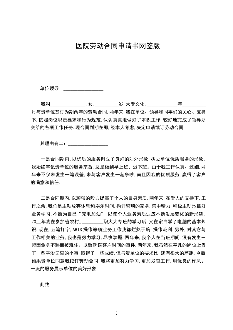 我叫_______________,女,__________岁,大专文化,_____________年__________月与贵单位签订为期两年的劳动合同,两年来,我在单位、领导和同事们的关心、支持下,按照岗位职责要求和行为规范,认认真真地做好了本职工作,较好地完成了领导所交给的各项工作任务.现合同到期在即,经本人考虑,决定申请续订劳动合同,
