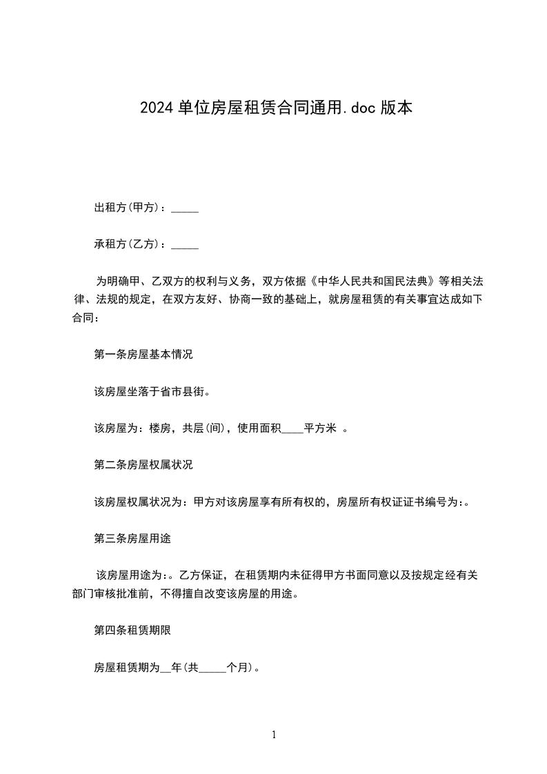 一、甲方将位于市小区号楼号的房屋出租给乙方居住使用,租赁期限自__年__月__日至__年__月__日,总计_____个月。