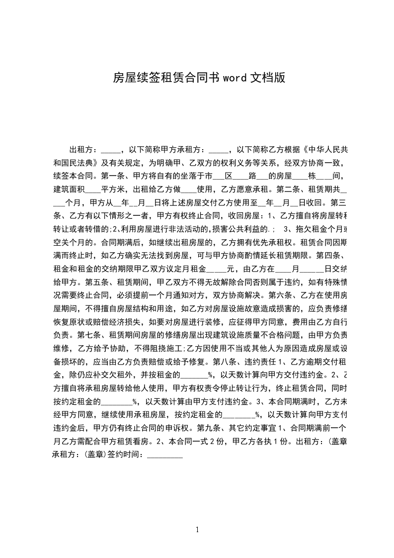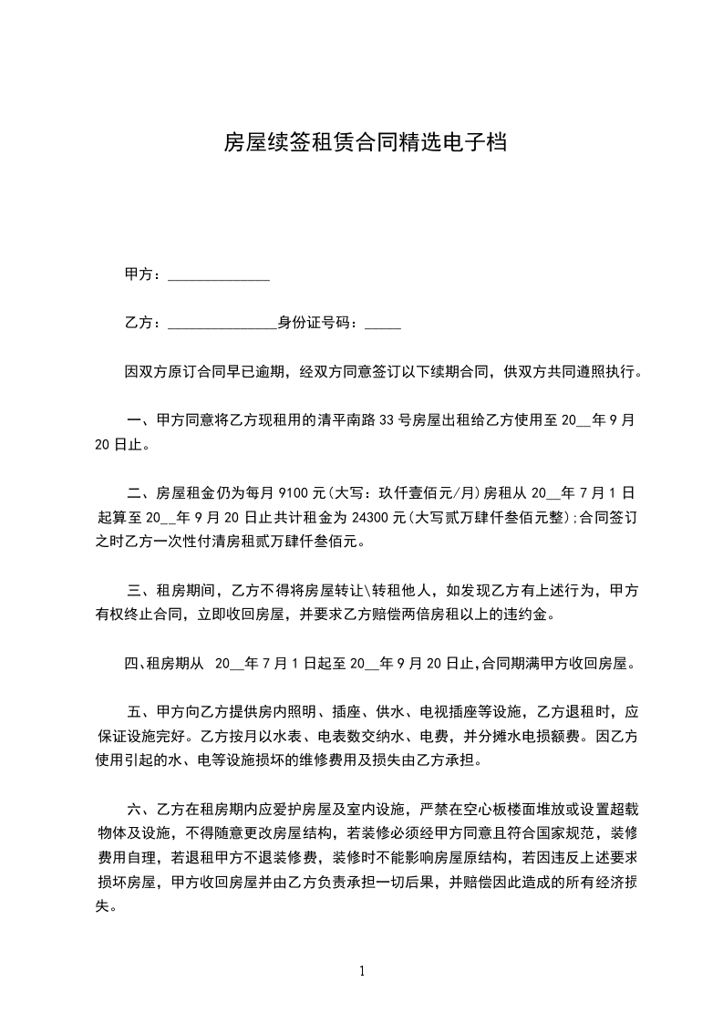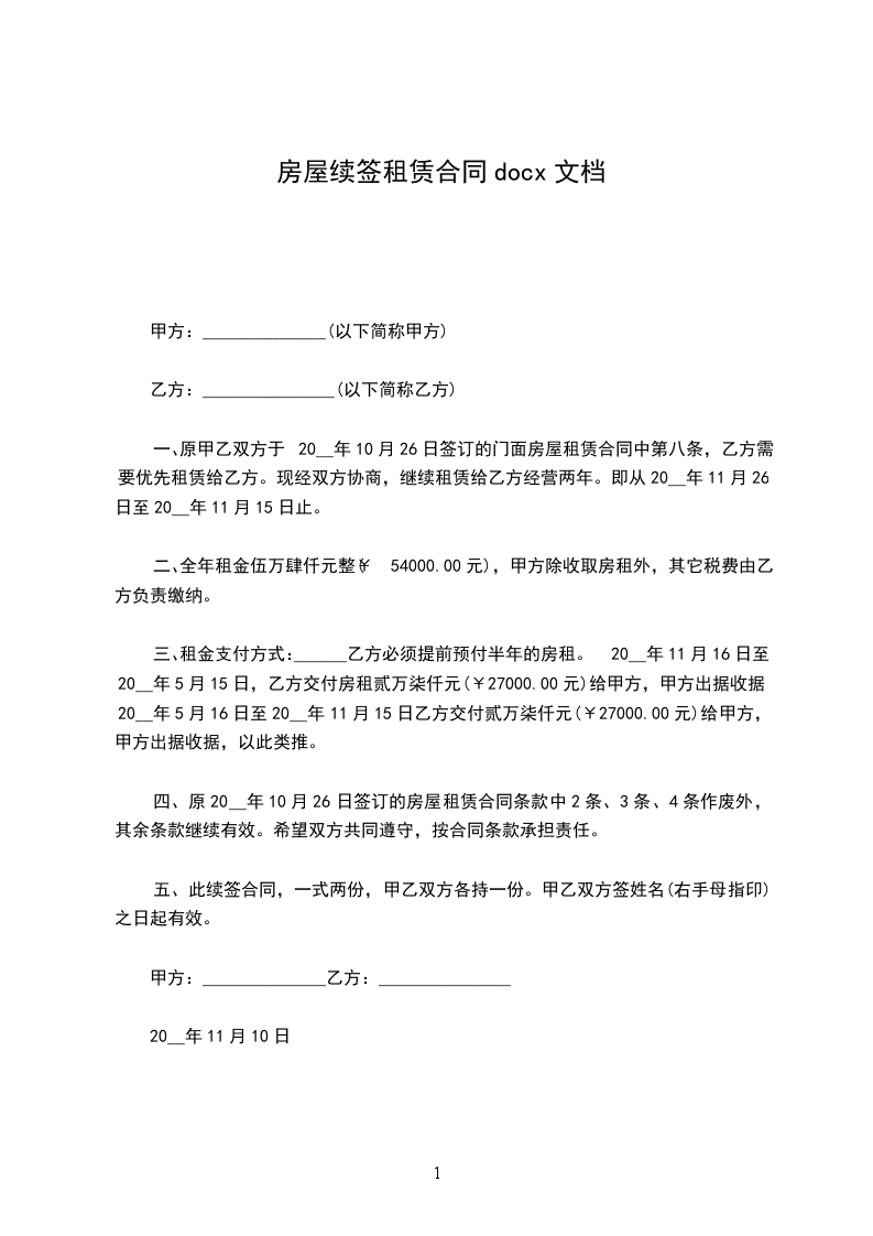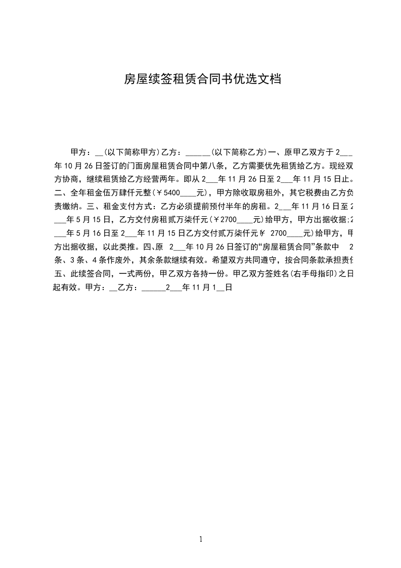 一、原甲乙双方于20__年10月26日签订的门面房屋租赁合同中第八条,乙方需要优先租赁给乙方。现经双方协商,继续租赁给乙方经营两年。即从20__年11月26日至20__年11月15日止。
