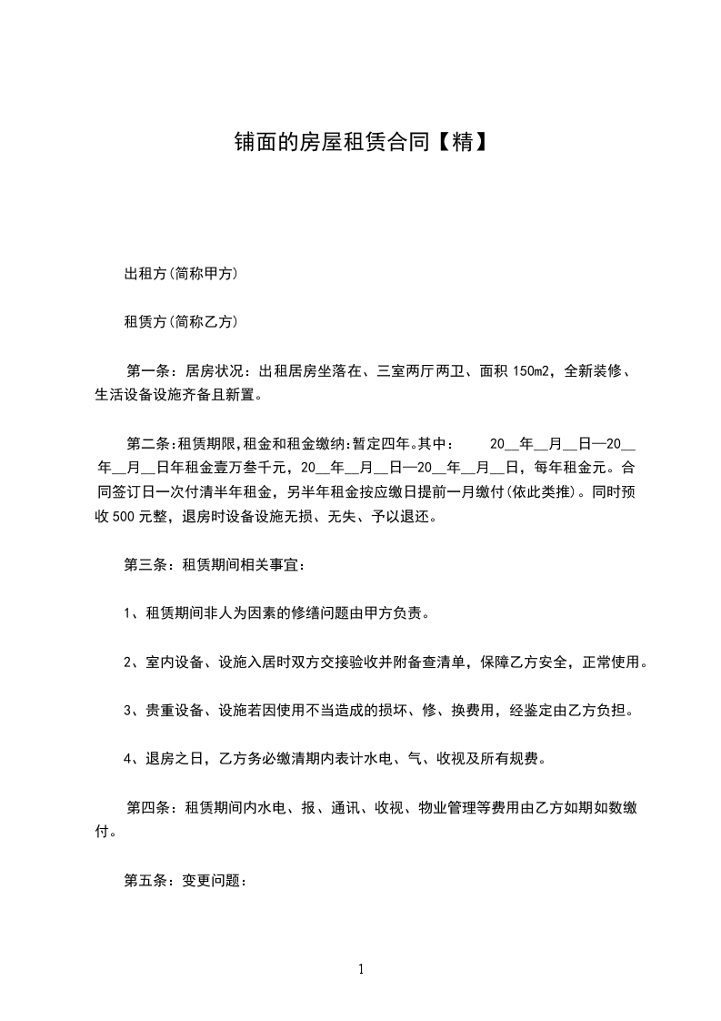 第一条:居房状况:出租居房坐落在、三室两厅两卫、面积150m2,全新装修、生活设备设施齐备且新置。