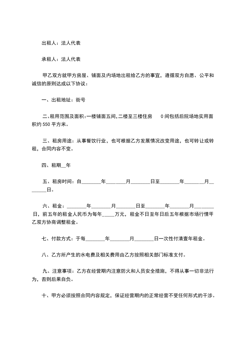 第二条:租赁期限,租金和租金缴纳:暂定四年。其中:20__年__月__日—20__年__月__日年租金壹万叁千元,20__年__月__日—20__年__月__日,每年租金元。合同签订日一次付清半年租金,另半年租金按应缴日提前一月缴付(依此类推)。同时预收500元整,退房时设备设施无损、无失、予以退还。