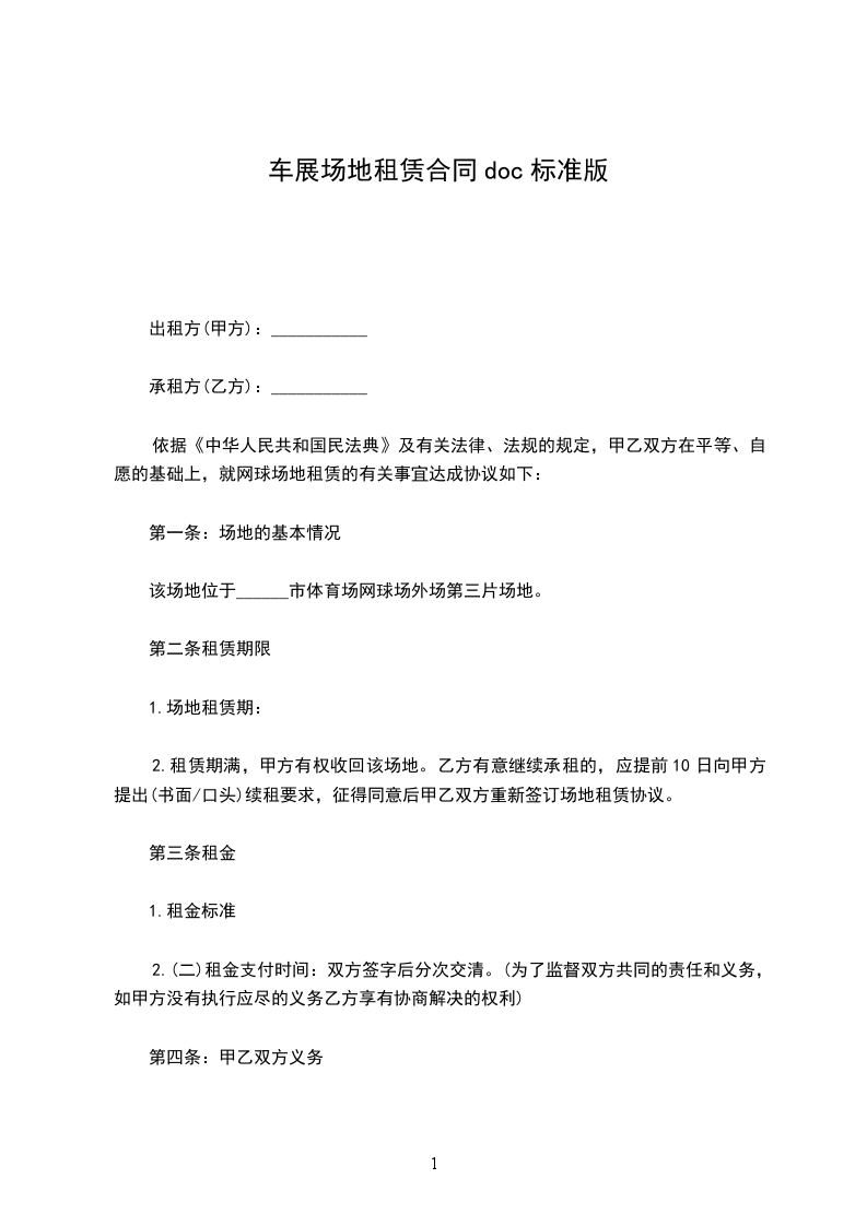 (一)租赁年限暂定四年(即从_______年_____月___日起至_______年_____月___日)。场地租金按实际使用占地面积每月____________(______元/平方米)计算,两年内不变。