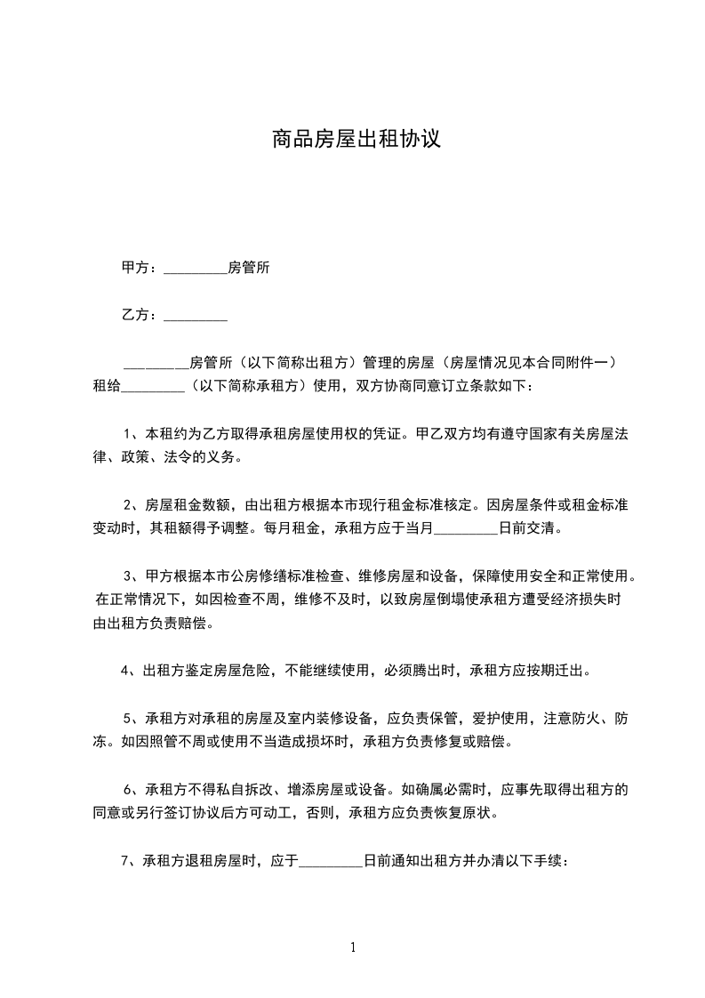 _________房管所(以下简称出租方)管理的房屋(房屋情况见本合同附件一)租给_________(以下简称承租方)使用,双方协商同意订立条款如下: