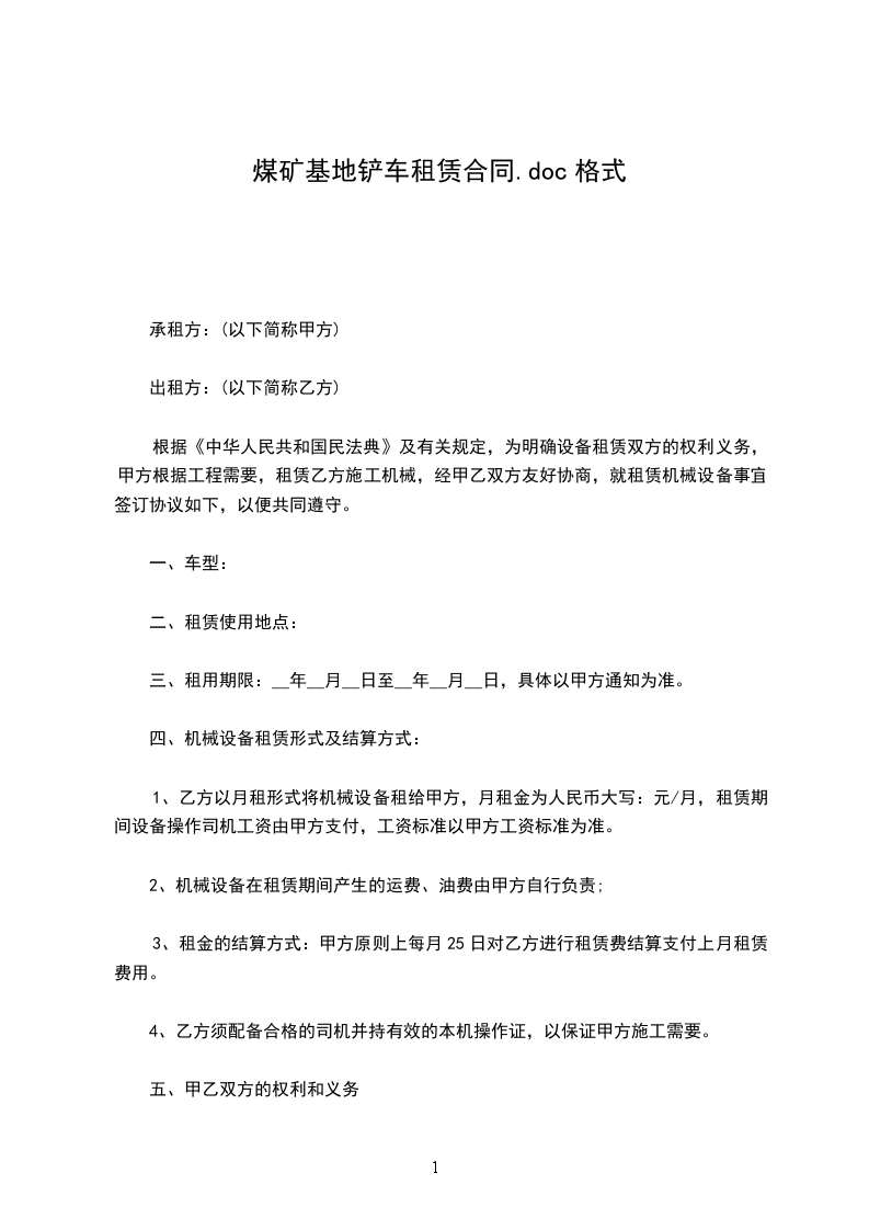 根据《中华人民共和国民法典》,双方在自愿、平等、诚实信用、协商一致的基础上,同意将型号铲车用于甲方施工工程使用,特订立本合同如下(以下简称甲方、乙方):_____