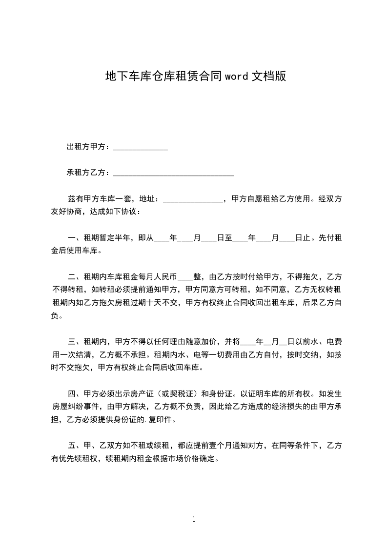兹有甲方车库一套,地址:_______________,甲方自愿租给乙方使用。经双方友好协商,达成如下协议: