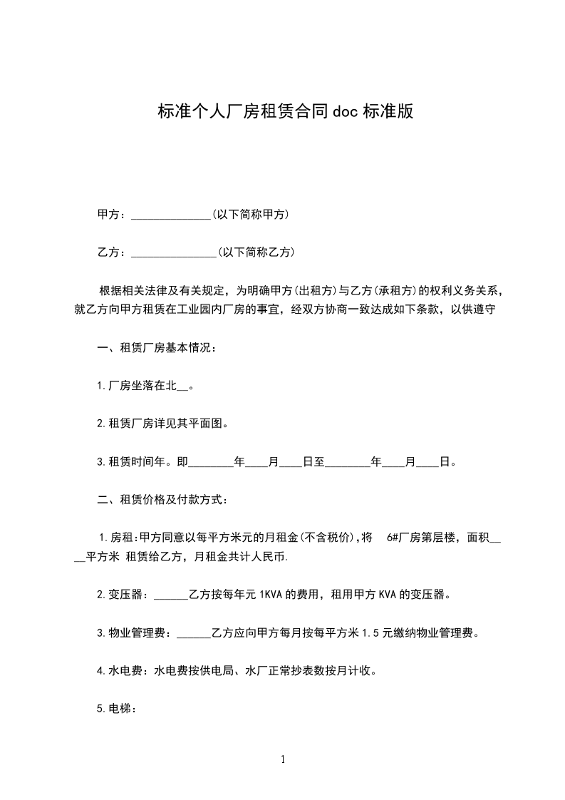 1.房租:甲方同意以每平方米元的月租金(不含税价),将6#厂房第层楼,面积____平方米 租赁给乙方,月租金共计人民币.