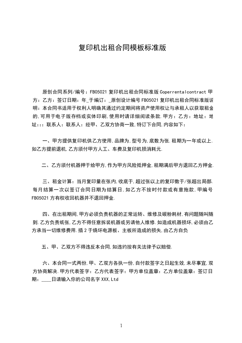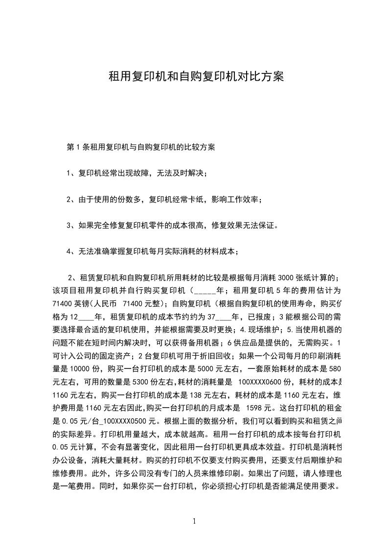 一、乙方向甲方租赁复印机_________台,机型_________,经甲、乙双方协商,特达成如下租赁协议。