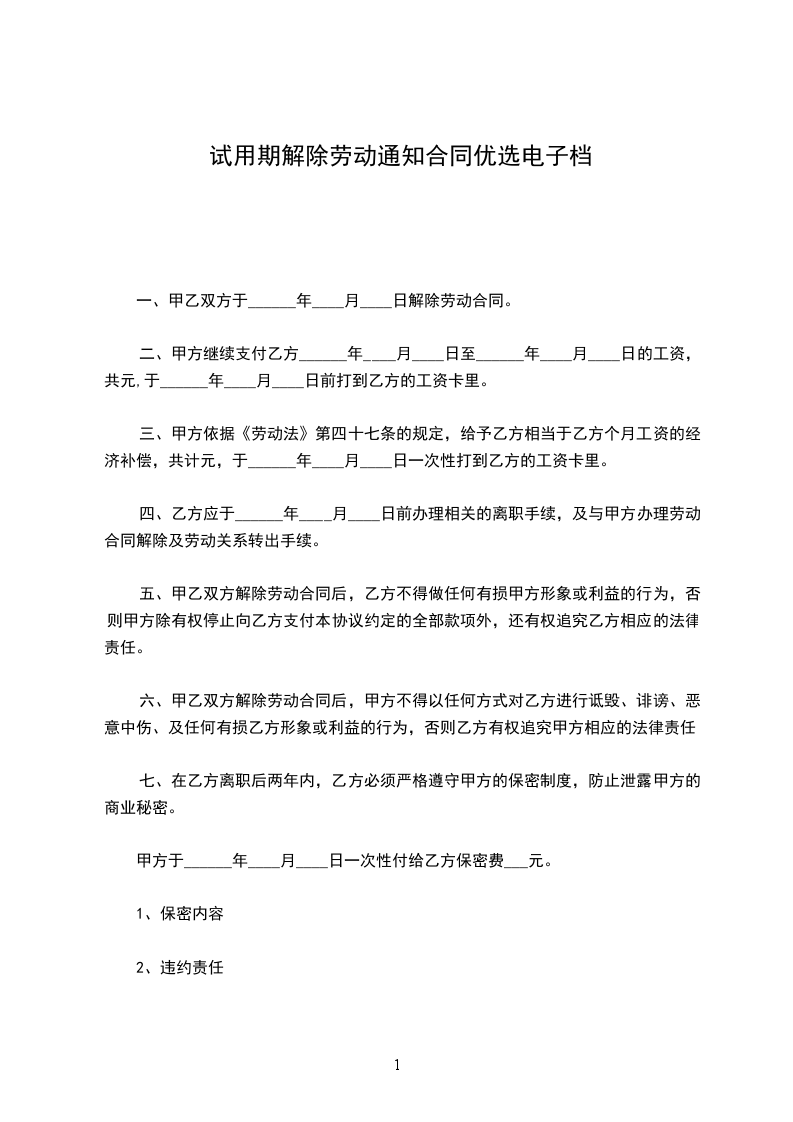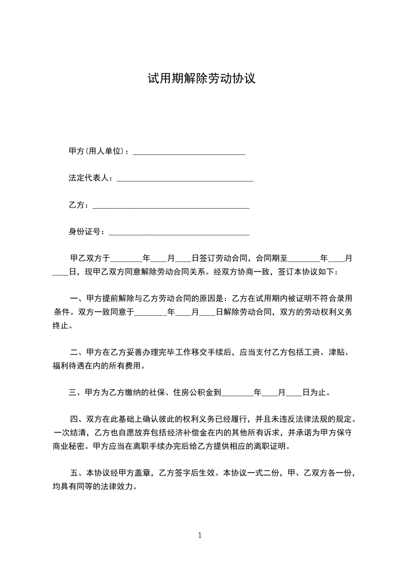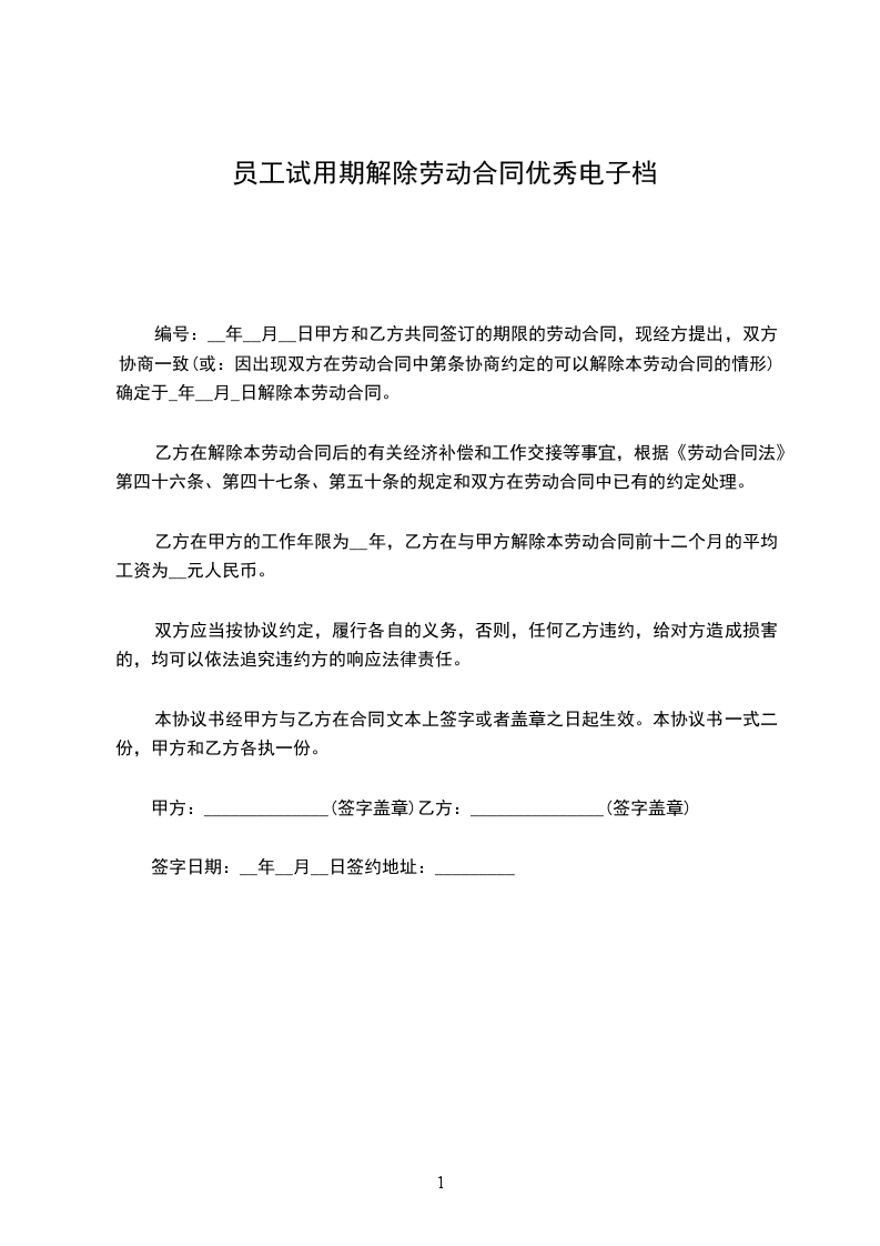 一、甲乙双方于_年__月_日解除劳动合同。