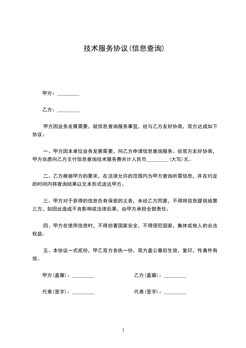 一、甲方因本单位业务发展需要,向乙方申请信息查询服务。经双方友好协商,甲方自愿向乙方支付信息查询技术服务费共计人民币_________(大写)元。