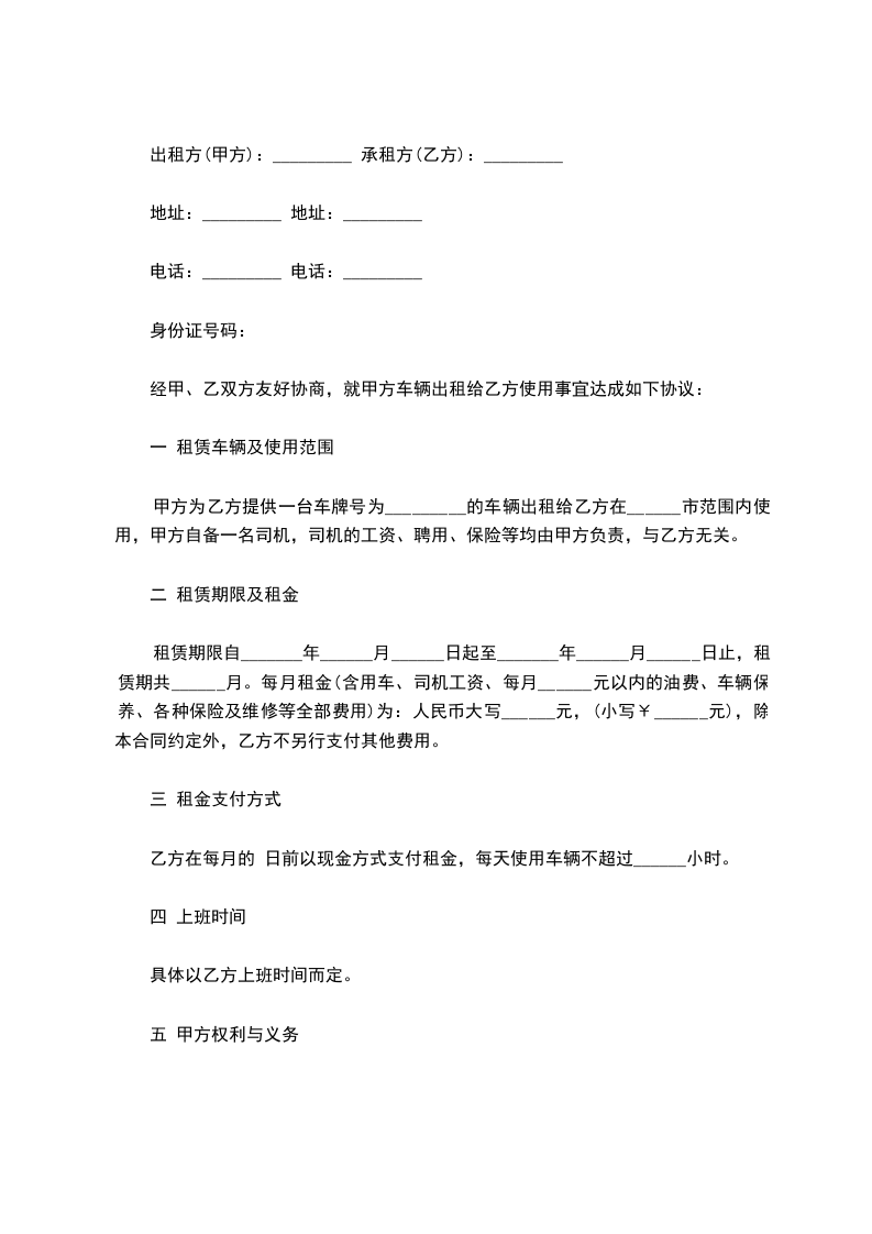 1.乙方因需要向甲方租赁________________型号车辆________辆,颜色为________色,车辆厂牌号为__________,车牌号________。