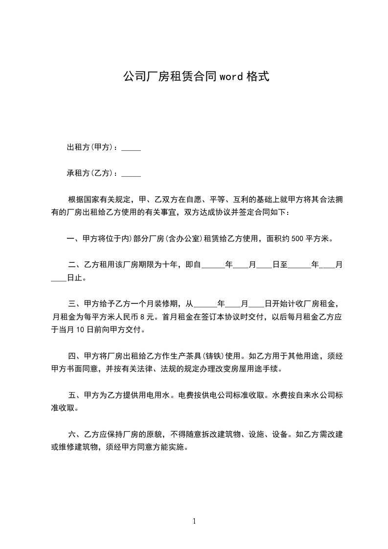二、乙方租用该厂房期限为十年,即自______年____月____日至______年____月____日止。