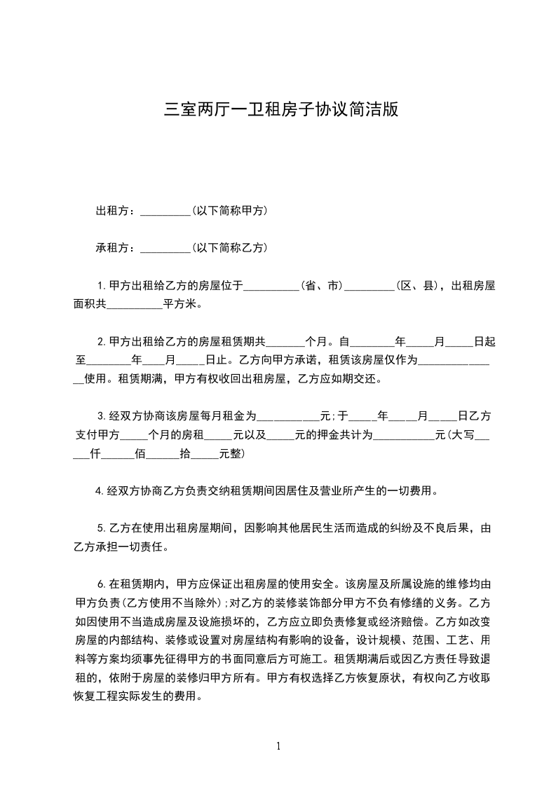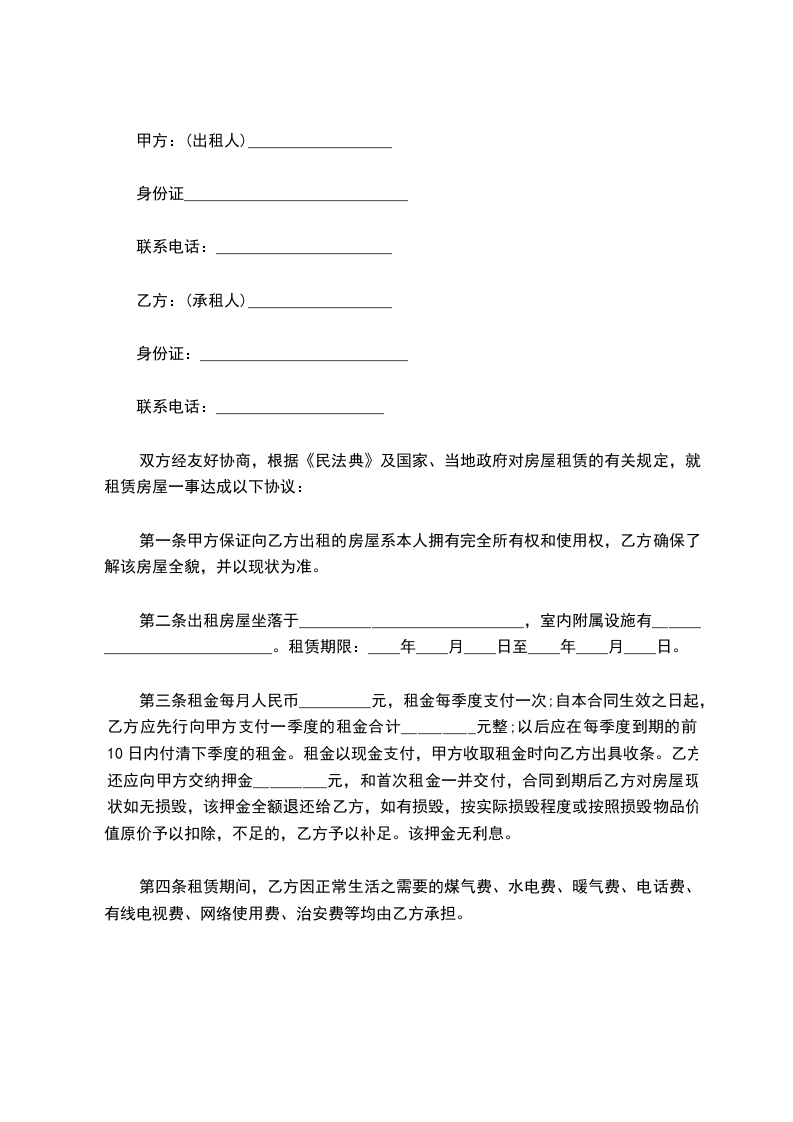 一、甲方将位于____市____街道___小区___号楼号的房屋出租给乙方居住使用,租赁期限自________年____月____日至________年____月____日,计___个月。