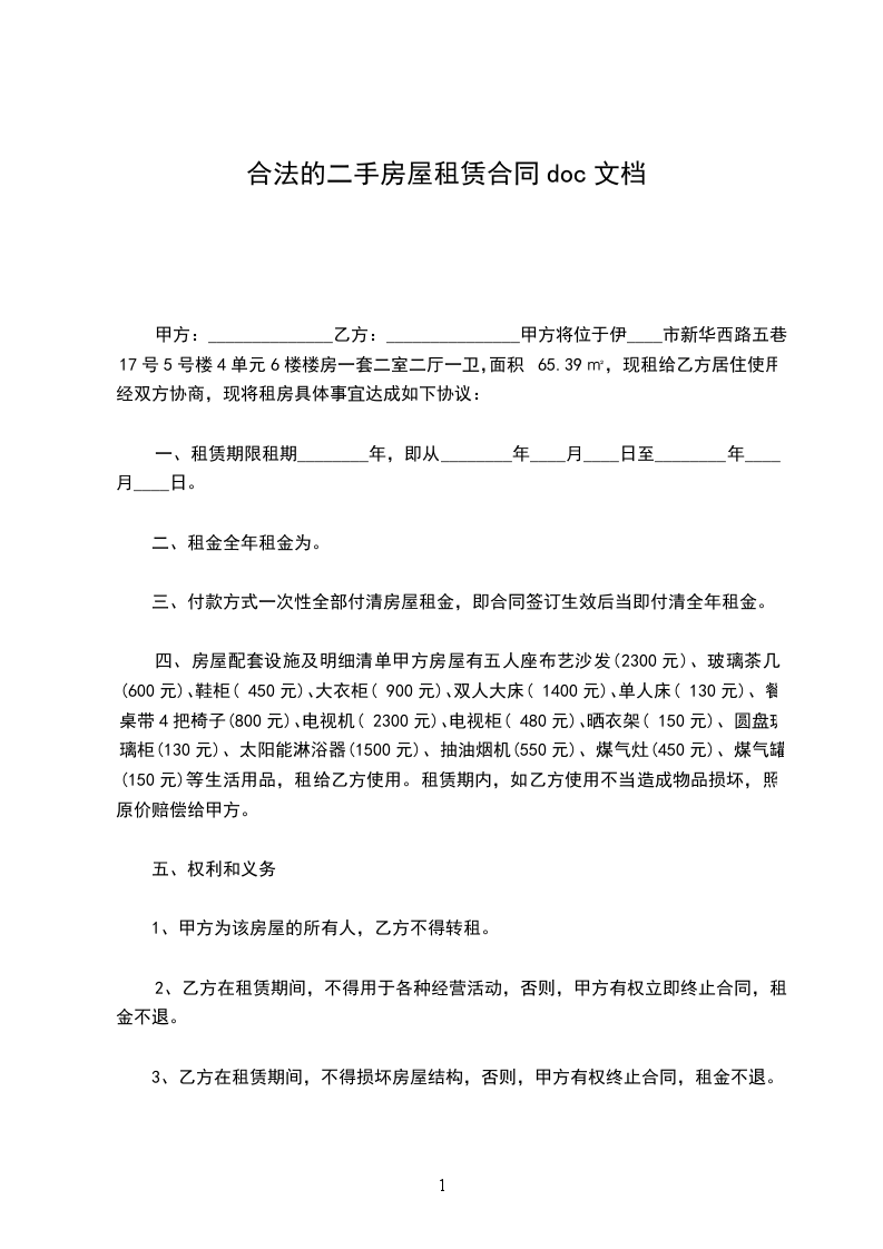 甲方:______________乙方:_______________甲方将位于伊____市新华西路五巷17号5号楼4单元6楼楼房一套二室二厅一卫,面积65.39㎡,现租给乙方居住使用,经双方协商,现将租房具体事宜达成如下协议: