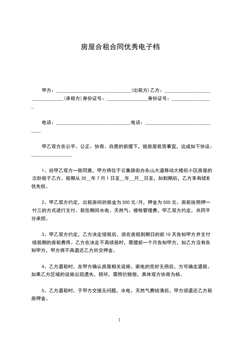 2、甲乙双方约定,出租房间的租金为500元/月,押金为500元。房租按照押一付三的方式进行支付。租住期间水电、天然气、楼栋管理费,甲乙双方约定,共同平分承担。