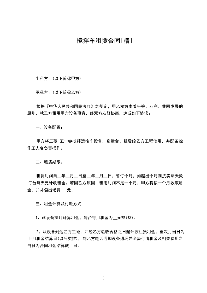 1、砼搅拌运输车一台车配备一名操作工人为乙方服务至合同期满,并承担其工资和奖金。
