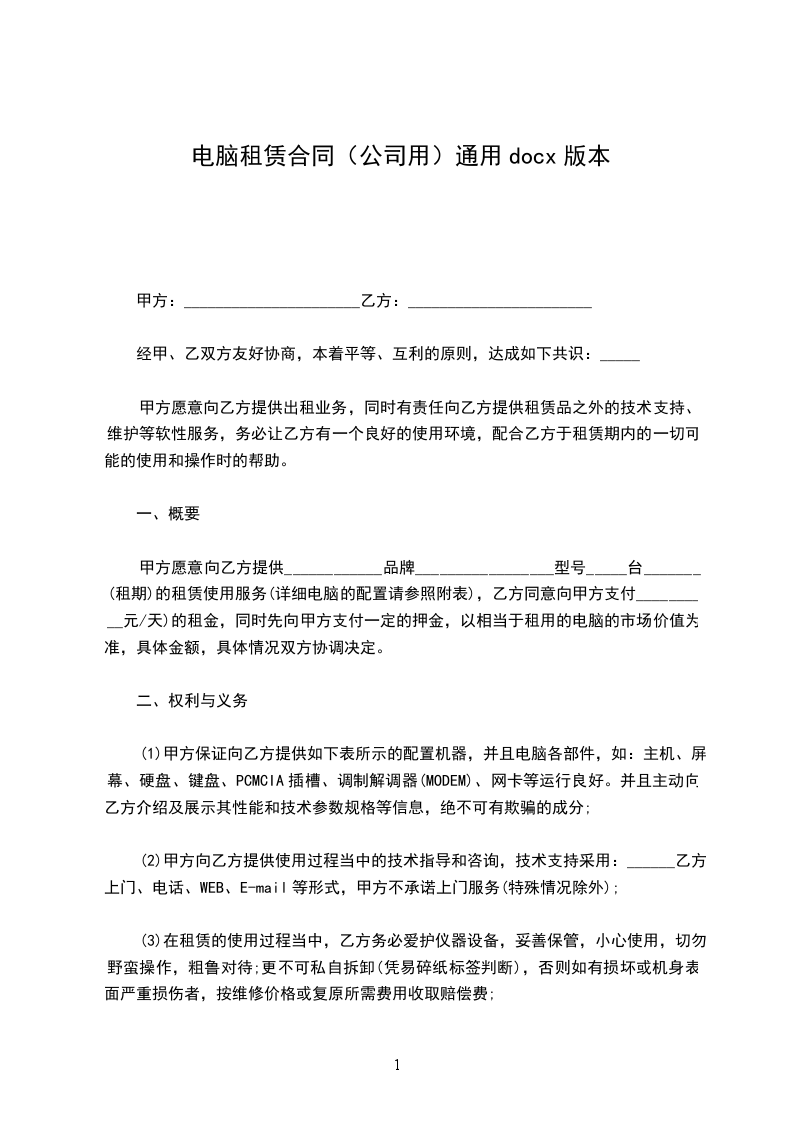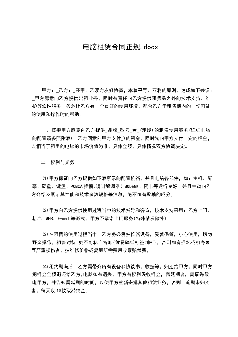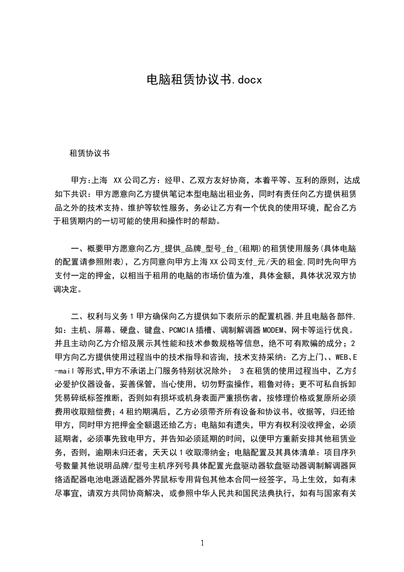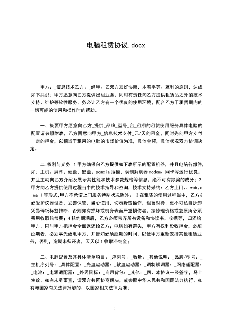 甲方愿意向乙方提供____________品牌_________________型号_____台_______(租期)的租赁使用服务(详细电脑的配置请参照附表),乙方同意向甲方支付__________元/天)的租金,同时先向甲方支付一定的押金,以相当于租用的电脑的市场价值为准,具体金额,具体情况双方协调决定。