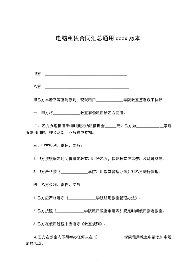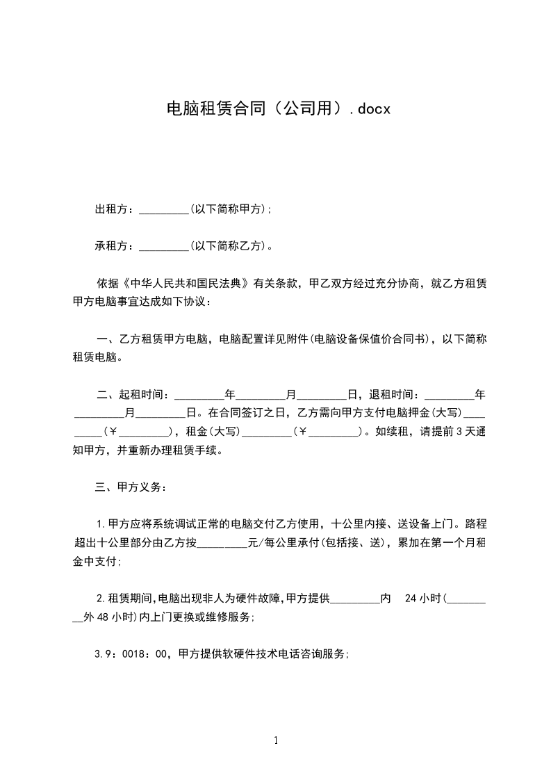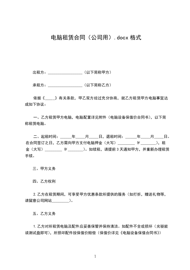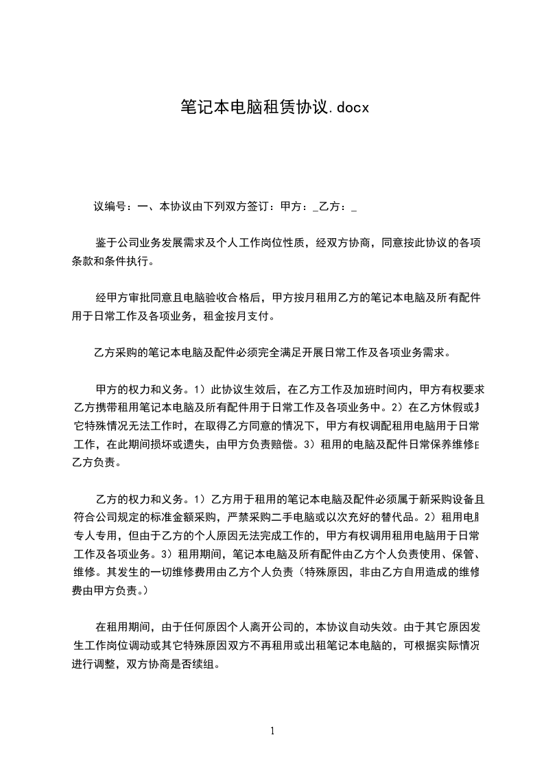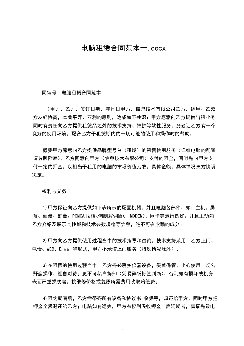 甲方愿意向乙方提供____________品牌_________________型号_____台_______(租期)的租赁使用服务(详细电脑的配置请参照附表),乙方同意向甲方支付__________元/天)的租金,同时先向甲方支付一定的押金,以相当于租用的电脑的市场价值为准,具体金额,具体情况双方协调决定。