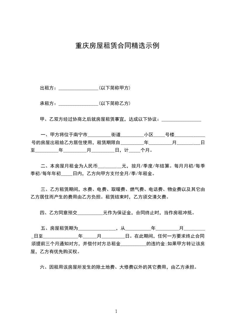 一、甲方将位于南宁市__________街道__________小区_____号楼_____________号的房屋出租给乙方居住使用,租赁期限自__________年__________月__________日至__________年__________月__________日,计_____个月。